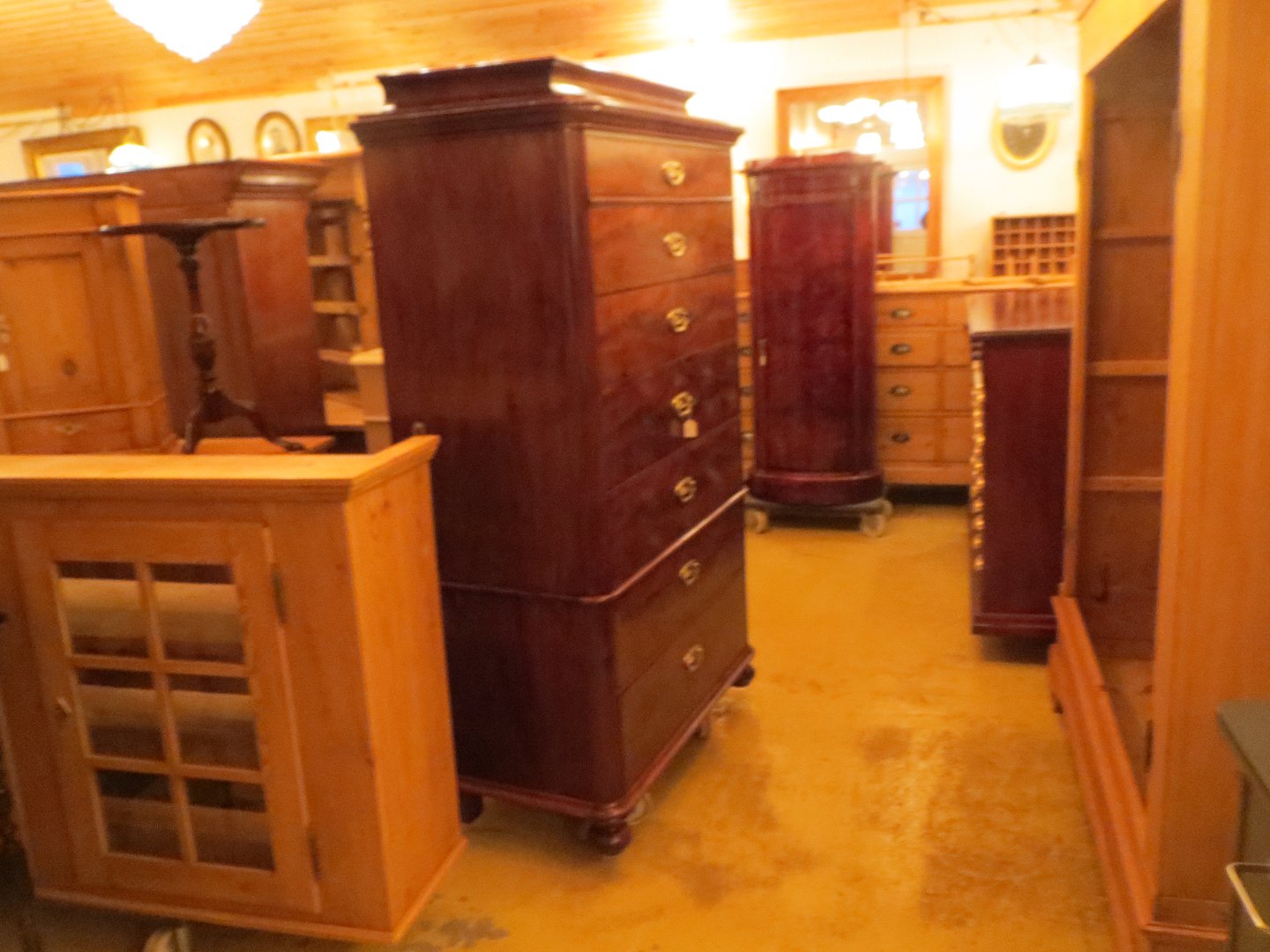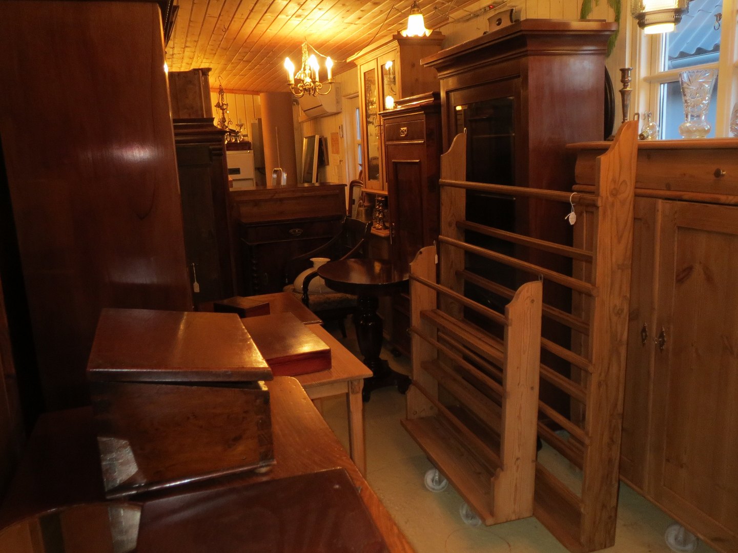 Stor salgsudstilling med restaurerede møbler håndpolerede mahognimøbler, afsyrede fyrretræsmøbler, malede træmøbler, kun originale gamle og antikke møbler.