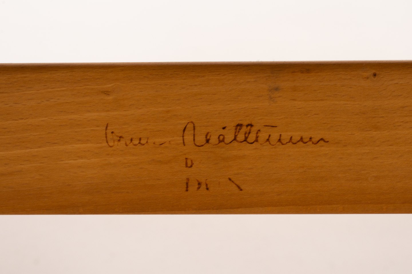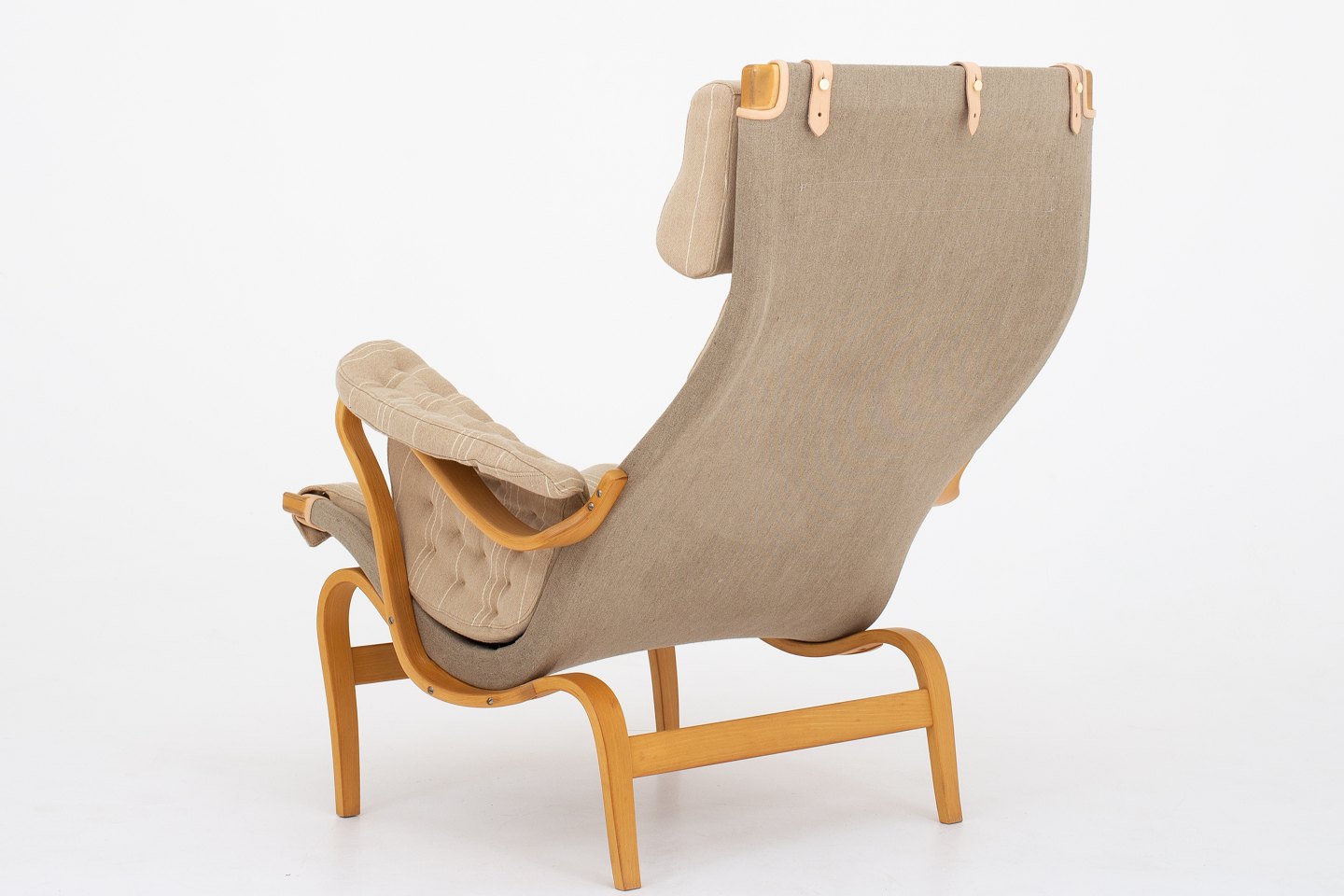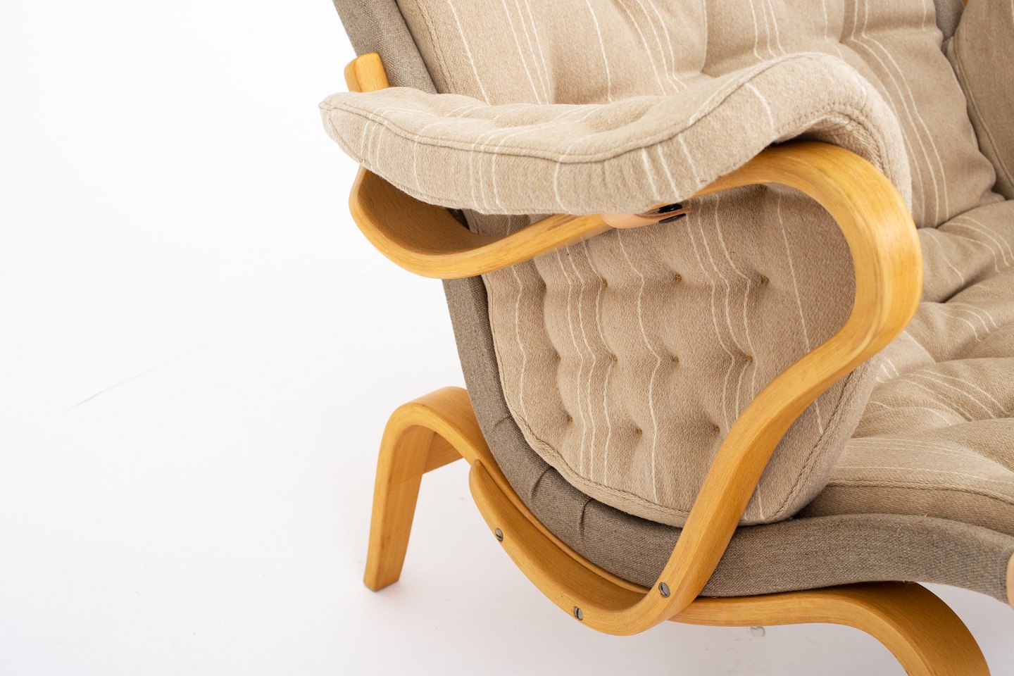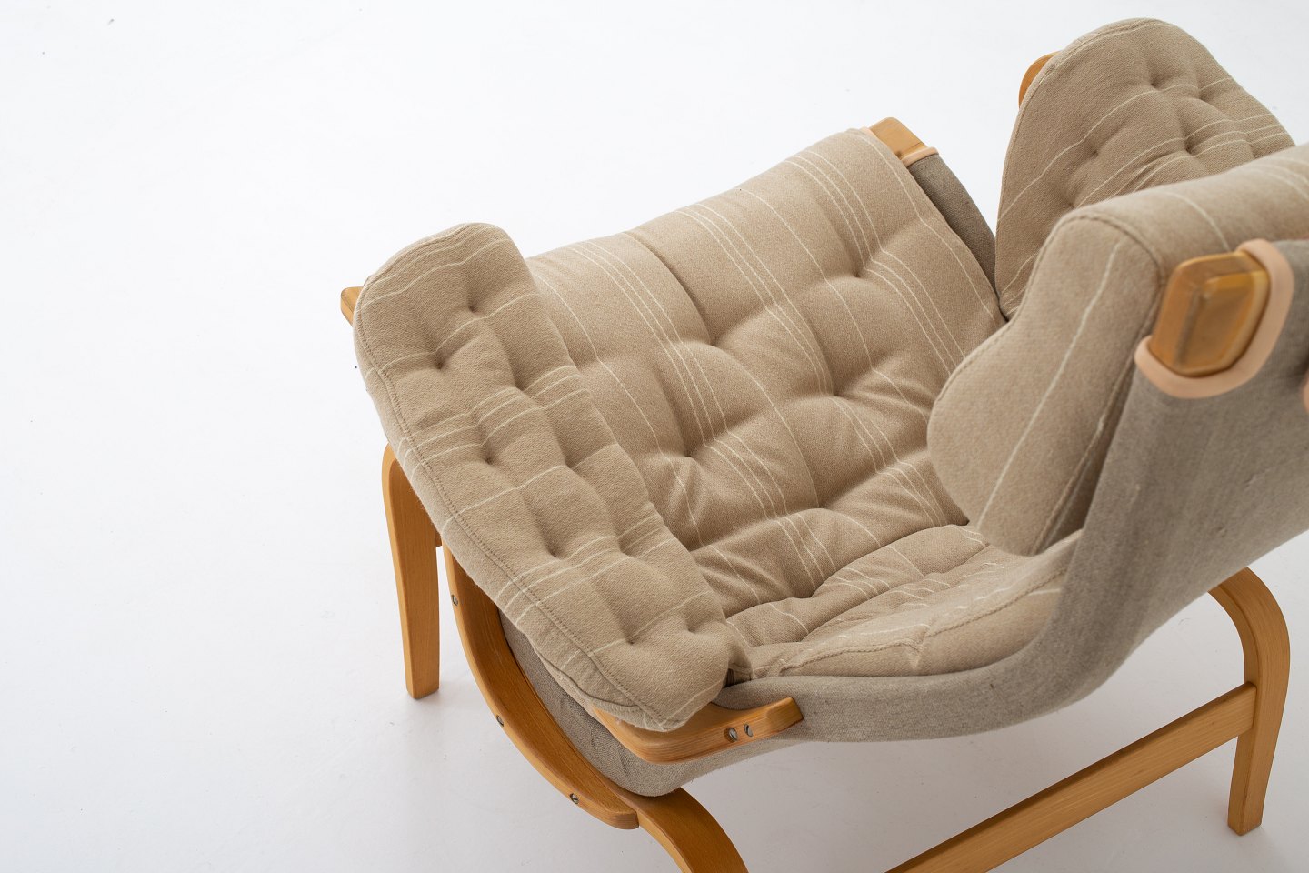 Pernilla 69 - Nybetrukket lænestol i bøg med Aalborg Møbelstof (Dessin A, farv. 11). KLASSIK tilbyder polstring af lænestolen med stof eller læder efter eget ønske. Kontakt os venligst for mere information.