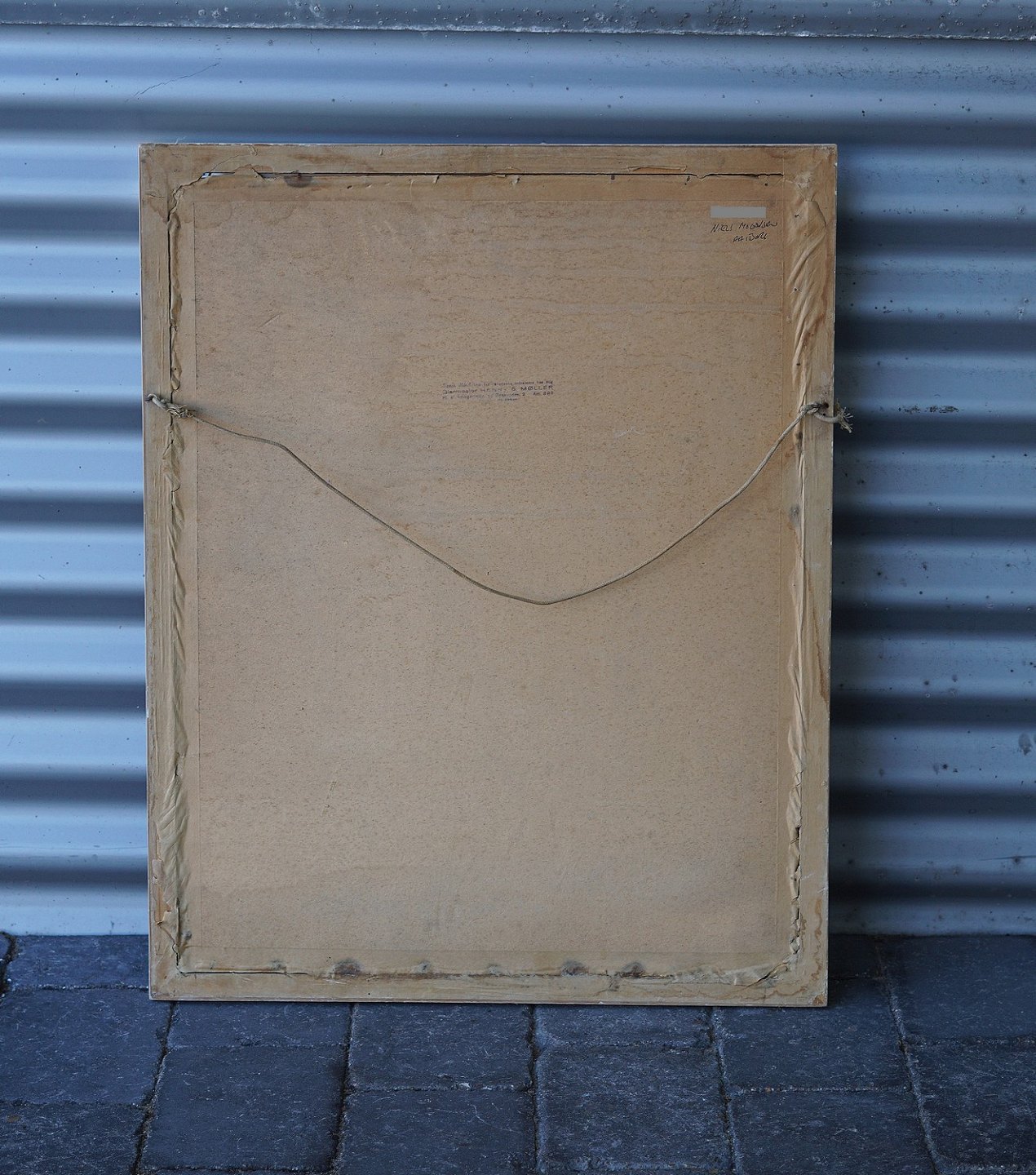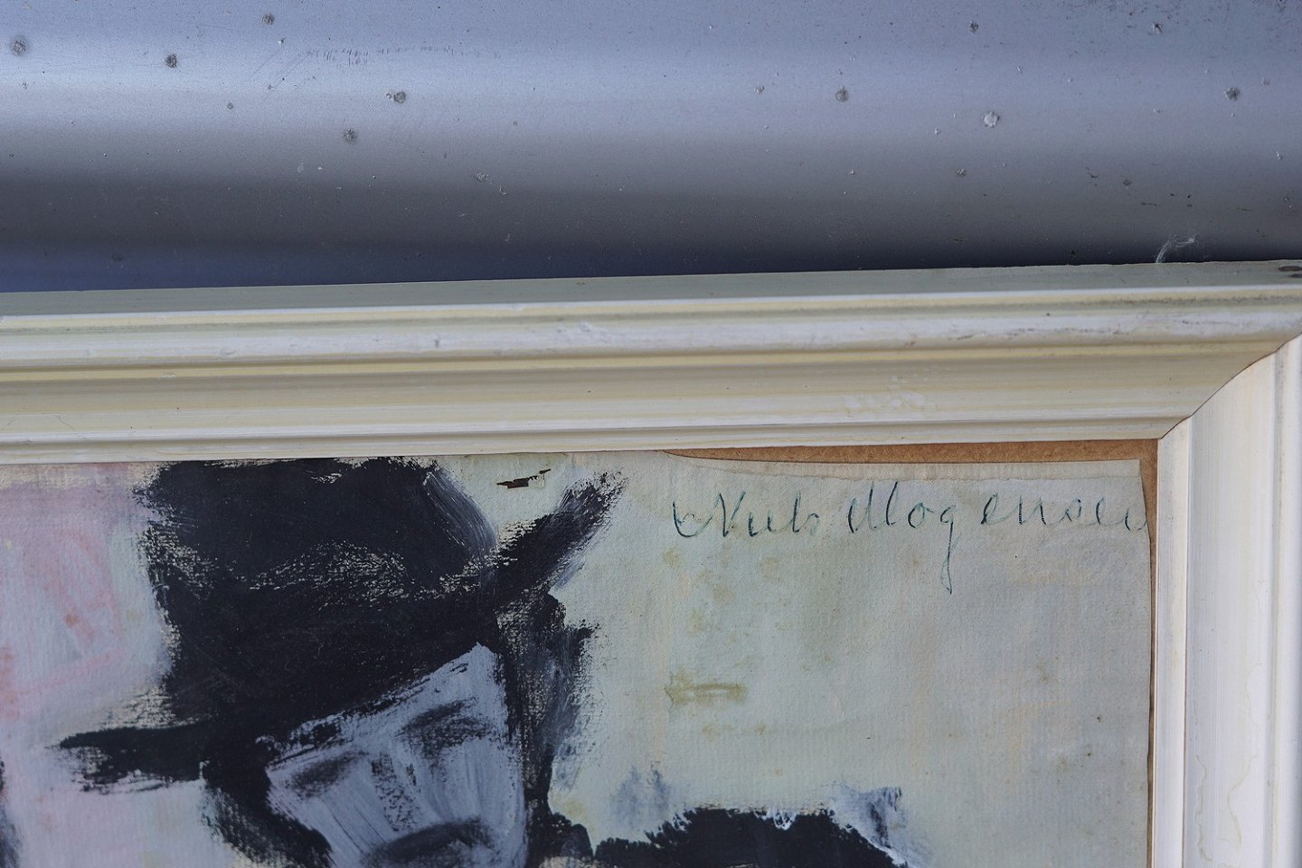 Maleri og Oliekridt af 2 musikanter med dame mellem sig.