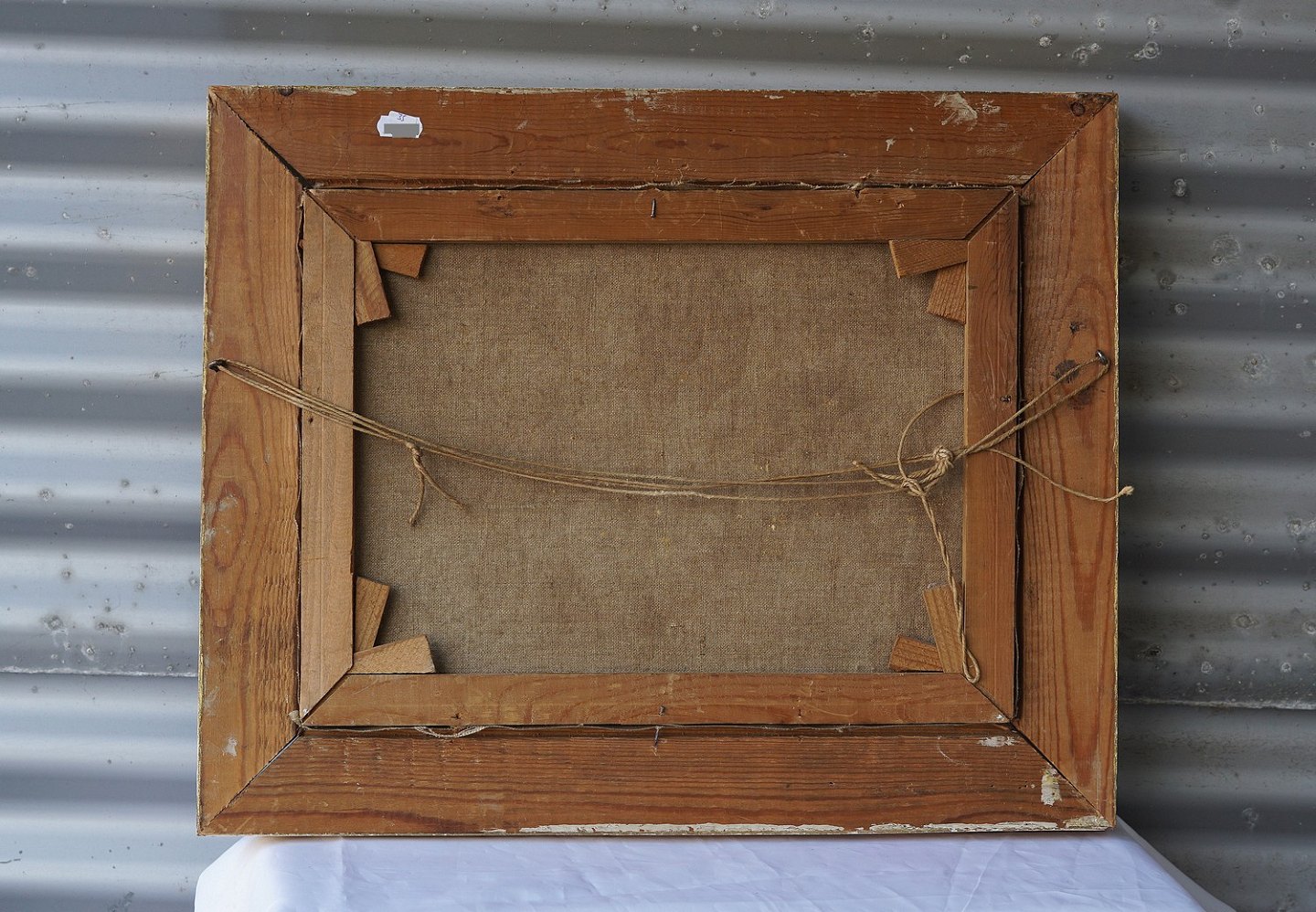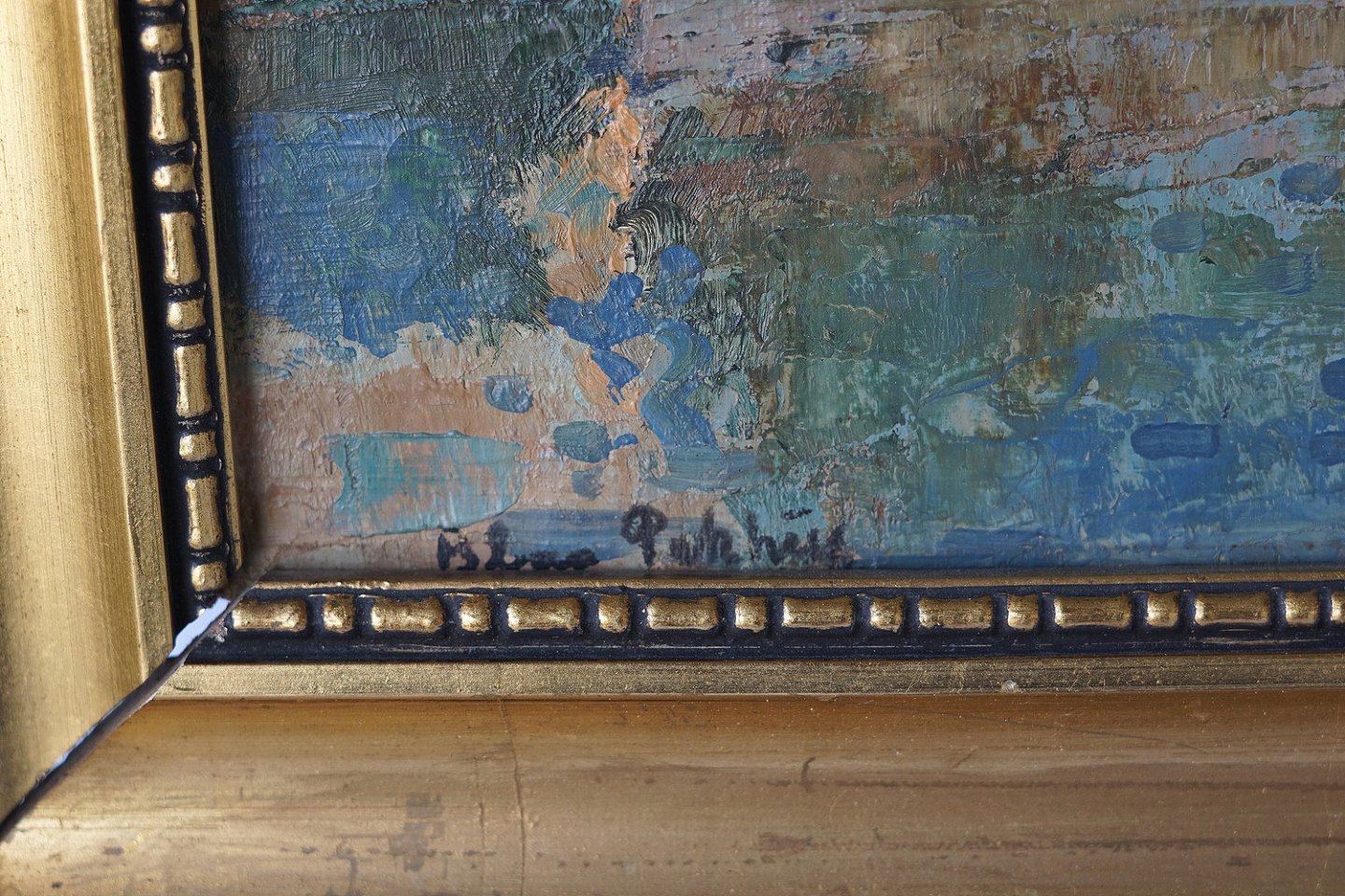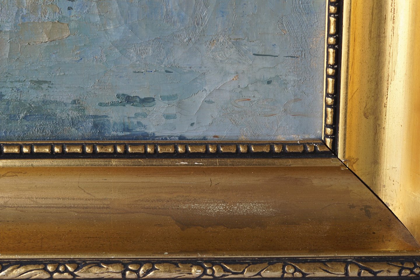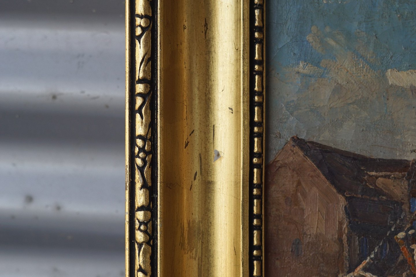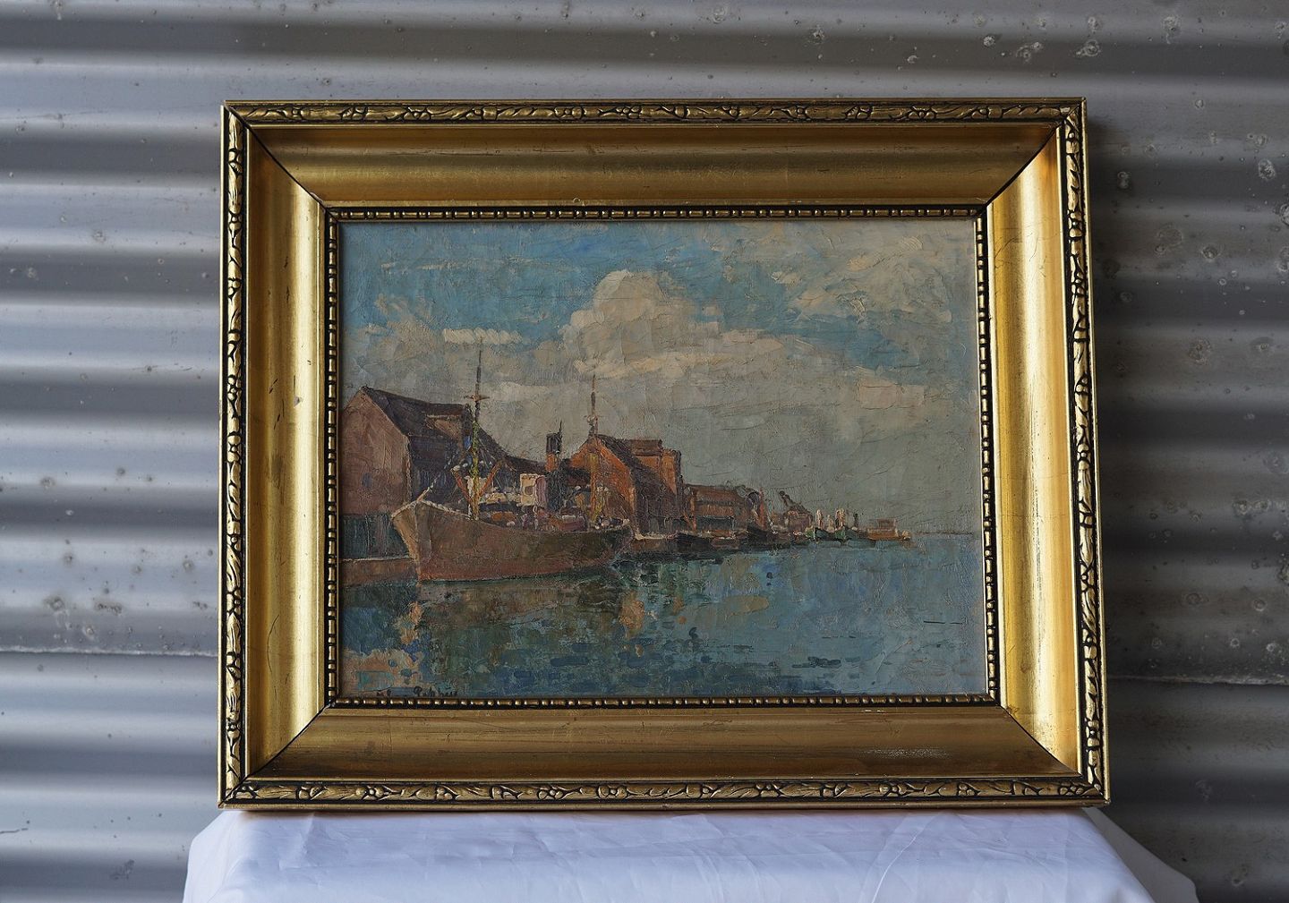 Havnemotiv "blaa Pakhus", olie på lærred, skib i havn