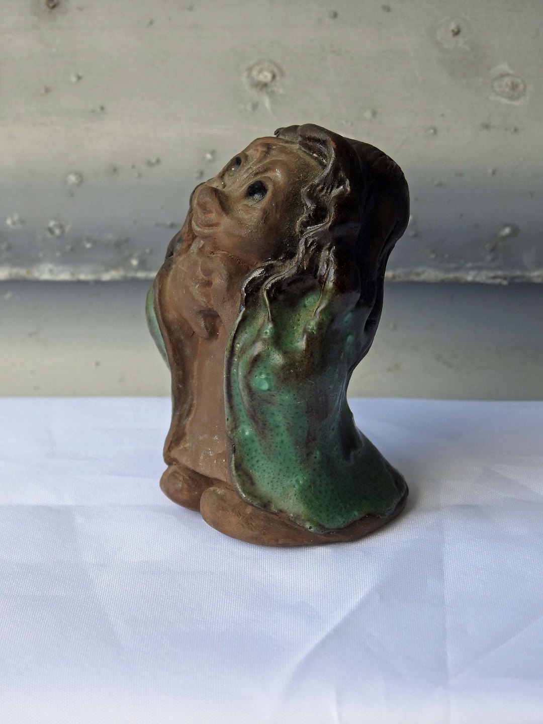Dam trold i keramik med motiv af Troldepige med grøn kappe