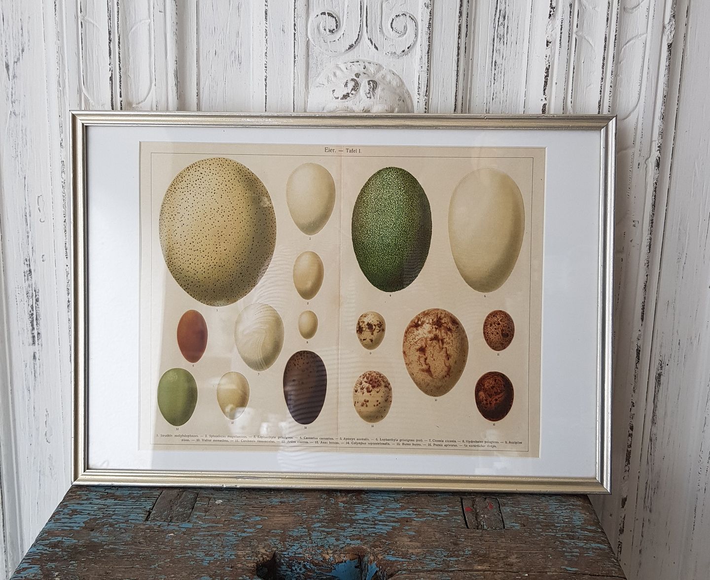 1800tals håndkoloreret tryk med æg i smuk enkel sølvramme.