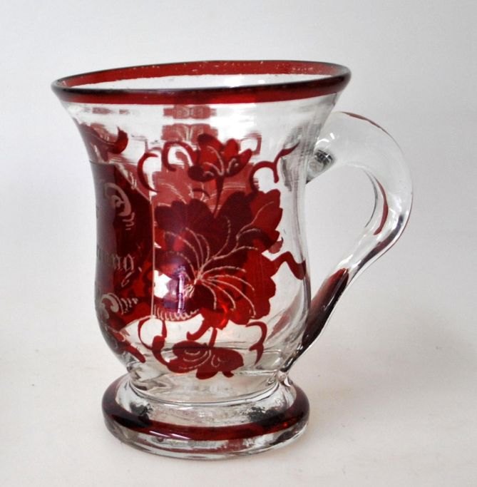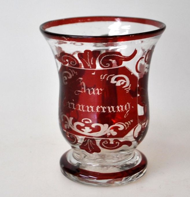 Tysk hanke glas krus, 19. årh. Klart glas med rødt overfang. Slebet. Med tekst: Zur Erinnerung. H.: 9 cm.