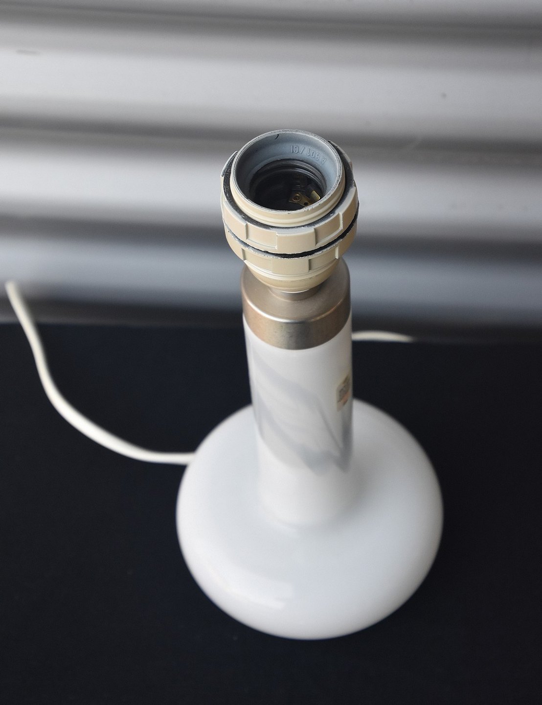 Lampen er lavet i hvidt opalineglas med et svagt blåt, bølget mønster