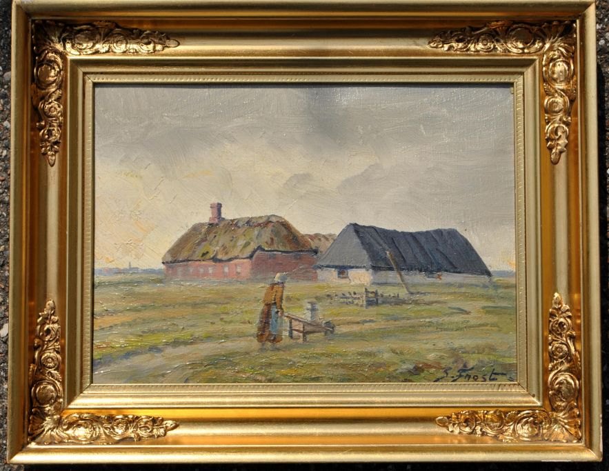 Frost, Sergius (1900 - 1994) Danmark: En gård, Holmsland Klit. Signeret. Olie på lærred. 21 x 29 cm.