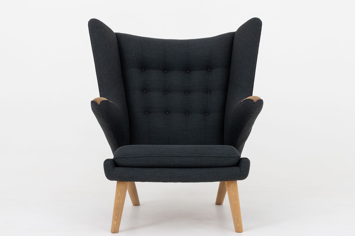AP 19 - Nybetrukket Bamsestol i Clara 2-stof (code: 987) med knapper i Savanne-læder (farve: Coffee). Poter og ben i eg.