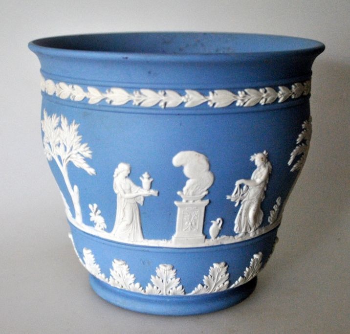 Wedgewood blue jasper flowerpot, 19th century England. With classic female figures. Stamped. H: 11 cm.