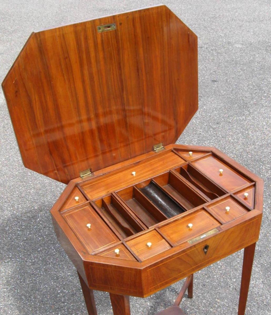 Empire sewing table, c. 1820. In mahogany with inlaid fruitwood. Hexagonal plate. With four slightly bent legs. Inside with several small rooms. H .: 72.5 cm. B .: 60 cm. D .: 43 cm.