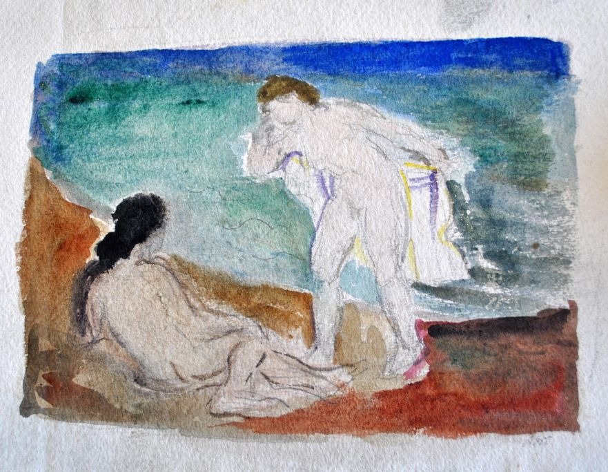 Telmanyi, Anne Marie (1893 - 1983) Danmark: To bandende kvinder. Akvarel på papir. Signeret. 20 x 25,5 cm.