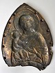 Græsk ikon i messing, 19. årh. Gudsmoder Hodigitria. Signeret. Med indgraveringer. Har tidligere været forsølvet. 28 x 20,5 cm.  Hodigitria betyder den vejvisende og vejledende. Gudmoder hæver højre hånd for at vise vej, vejlede hen til barnet.