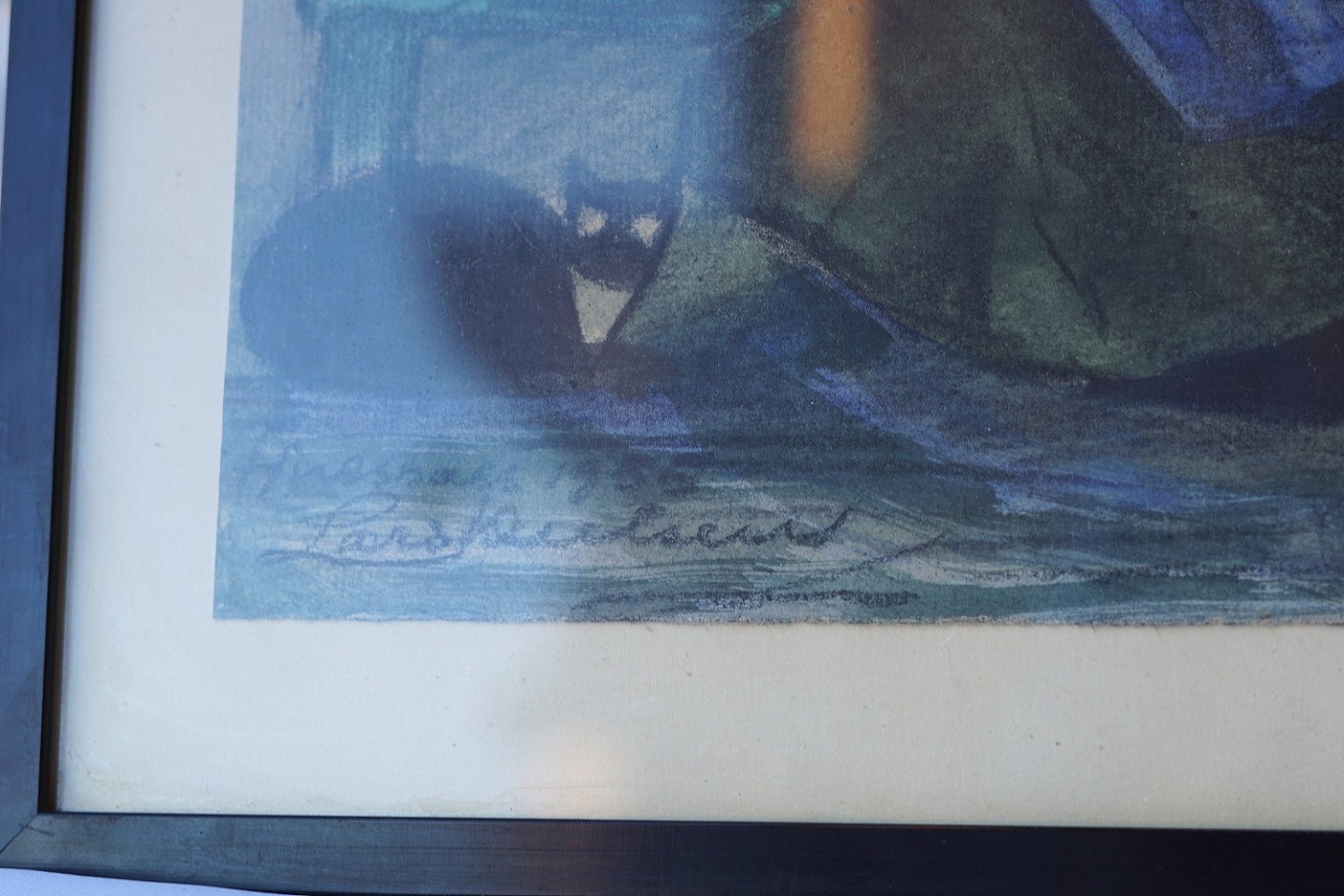 Strikkende dame " Hirtshals 1955". Billedet er lavet med oliekridt.