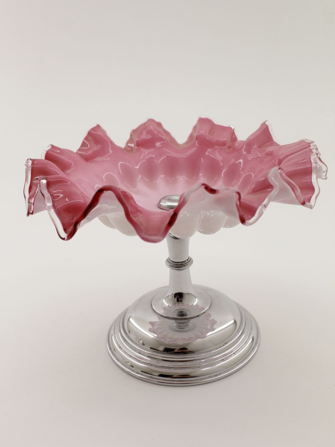 Kage/frugtopsats fra beg. af 1900-tallet med rosa glas på nikkel fod højde 17 cm. dia.21 cm. Nr. 366281
