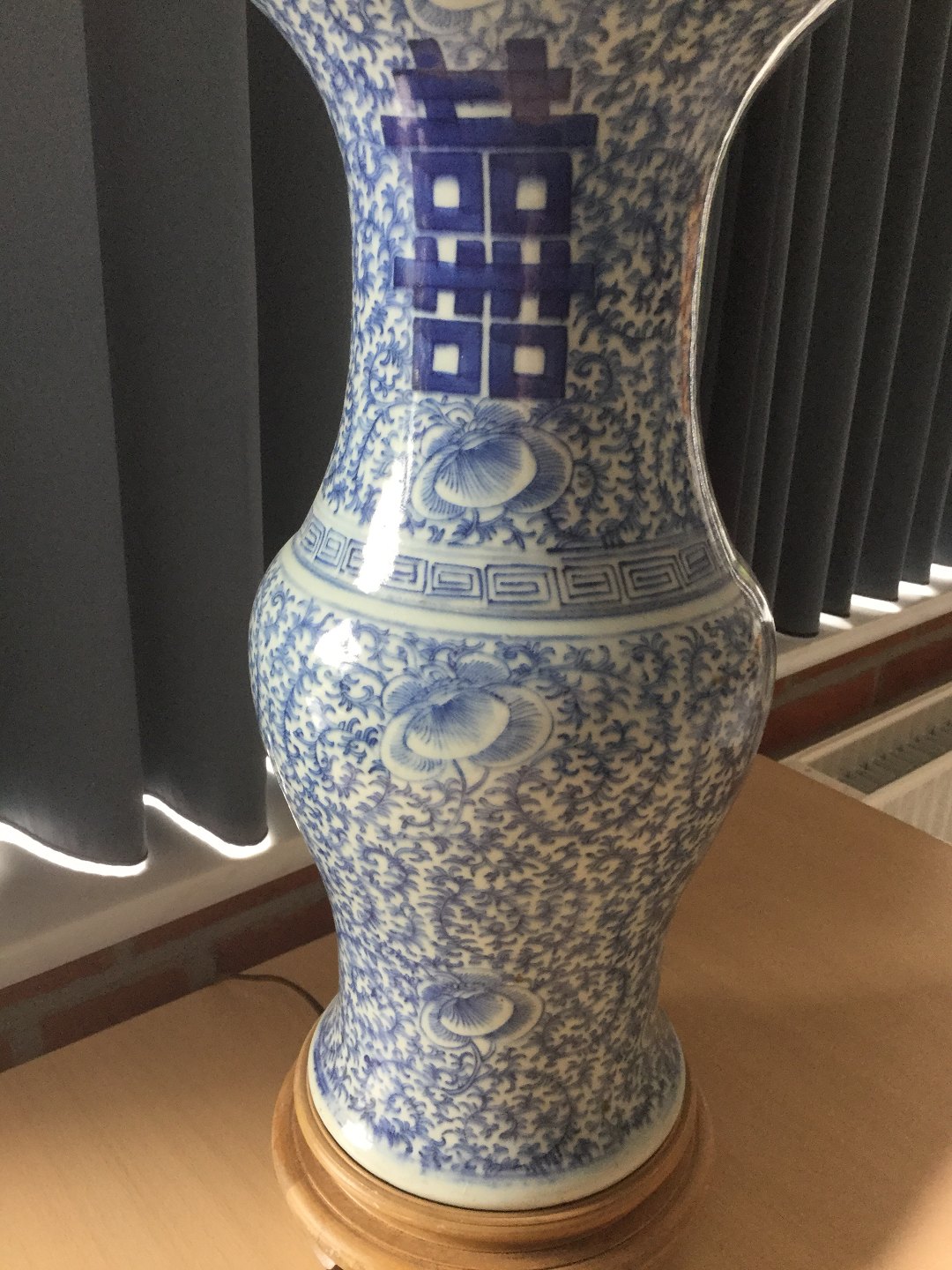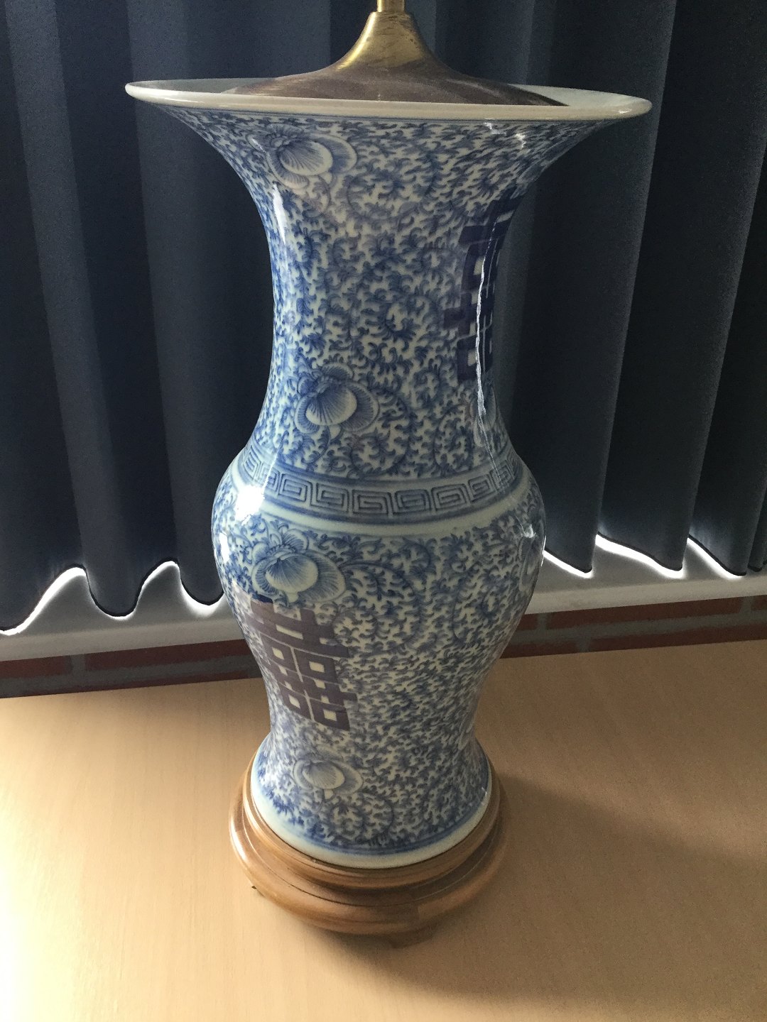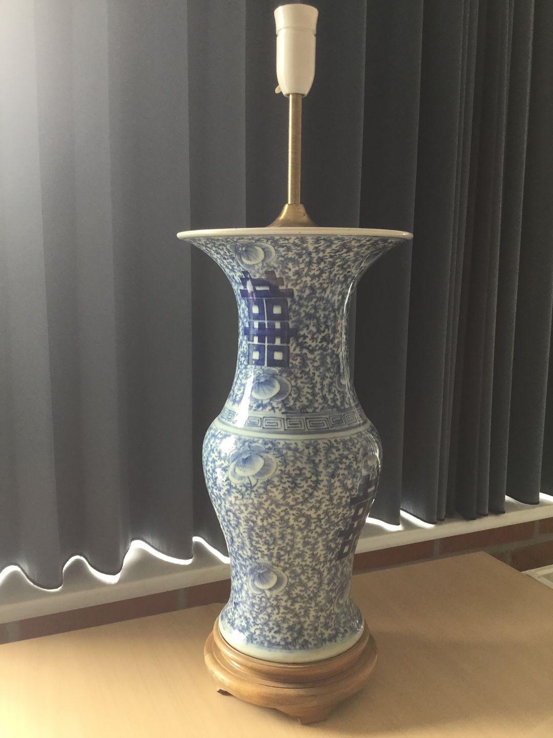 Vasen er monteret med træ stand og messingmontering i top. Den er gennemboret i bund for ledning.