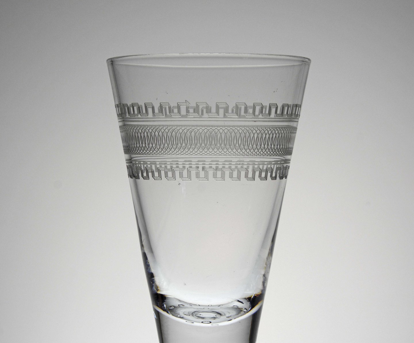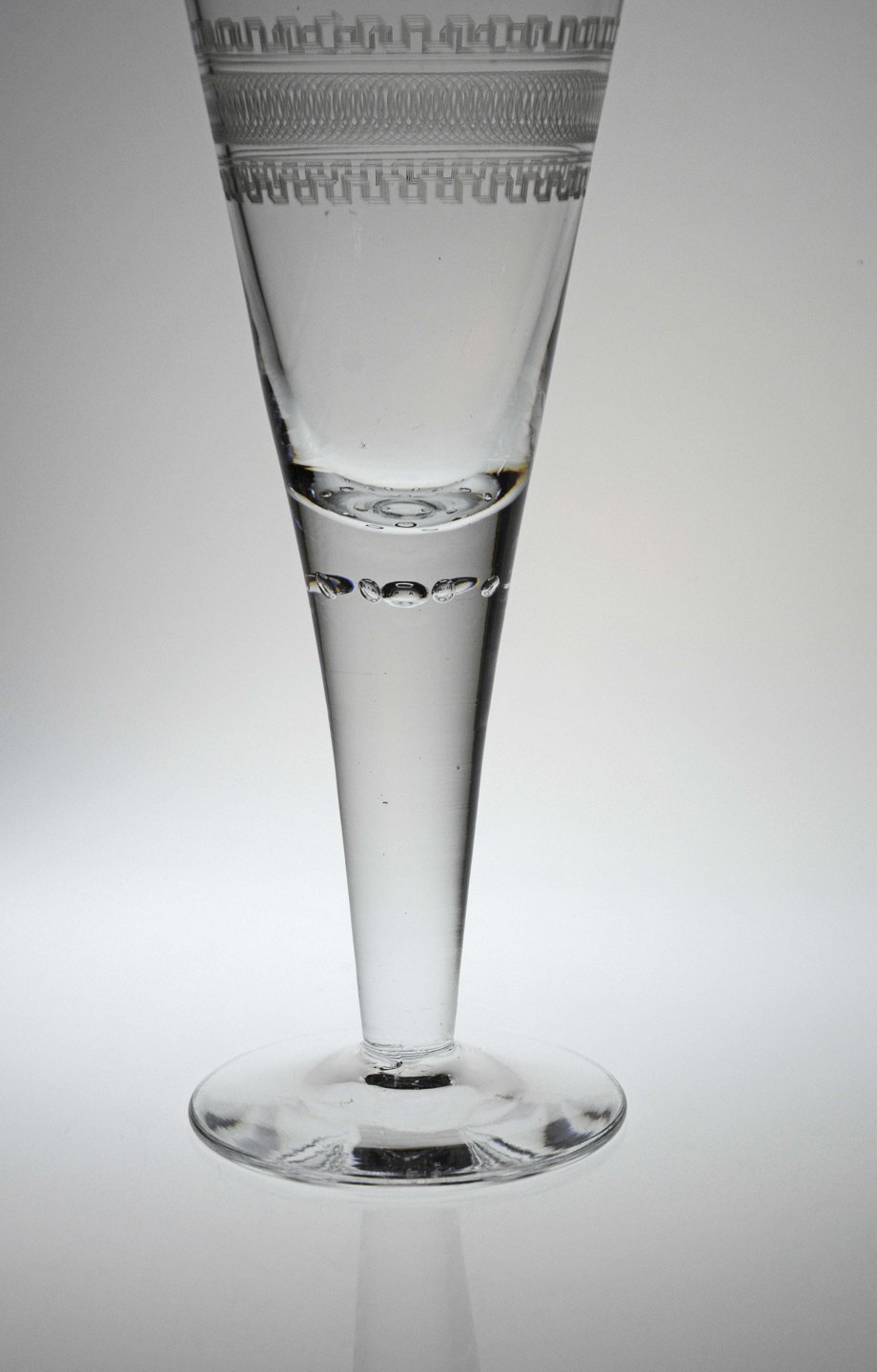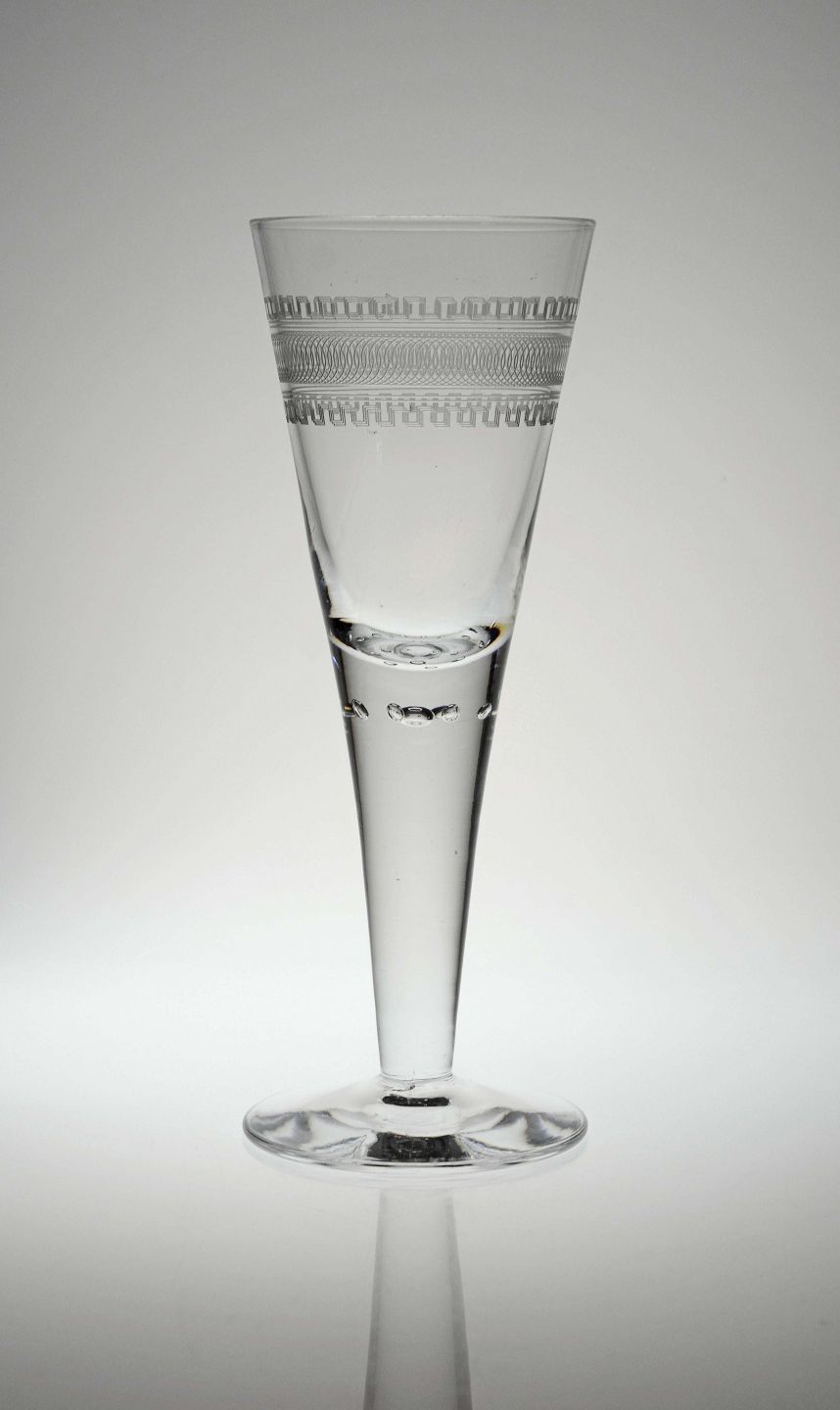 Pokalglas med guillocherede bort, formentlig Holmegaard, som lavede denne type mønster indtil 1910, Luftbobler under stilk og glattet bund