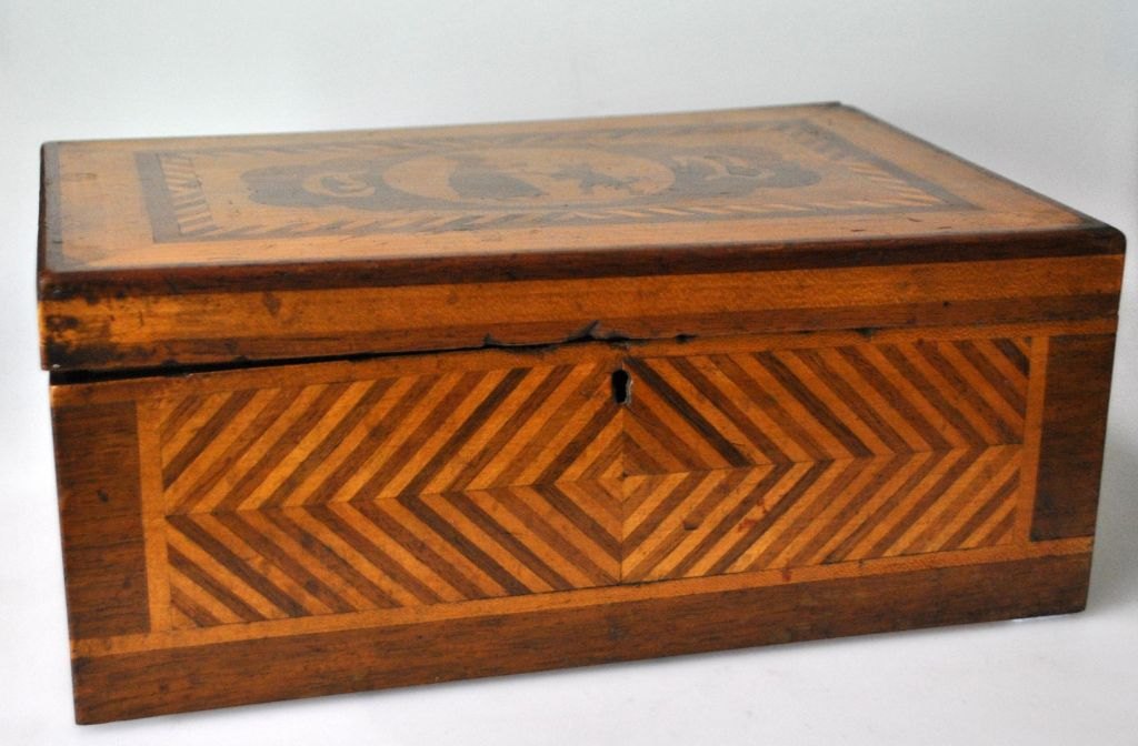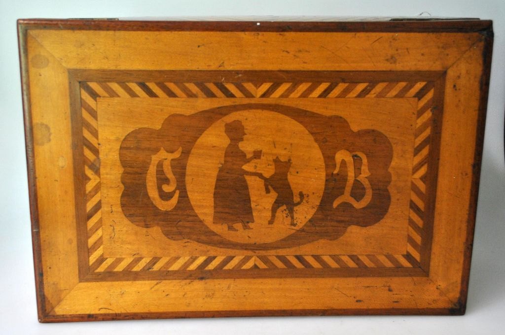 Dansk sy skrin i mahogni og frugttræ med intarsia. 19. årh. 28 x 19 x 11,5 cm. Intarsia i form af kvinde og hund og monogrtammet: CB. Indvendig med løftbar skuffe med rum. Lås mangler. Under bund label med navnet: Jos. Schmitz Nr. 116/1088.