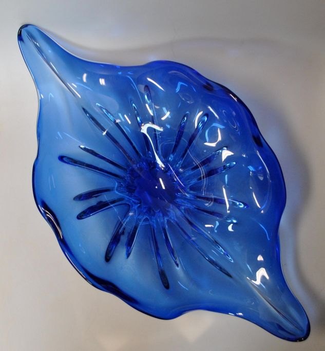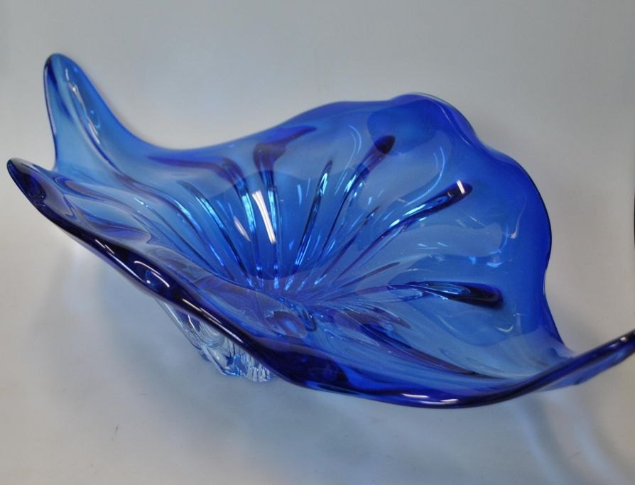 Glasskål, blå/klar glasmasse, 1960'erne, L.: 50,5 cm. H.: 14,5 cm. B.: 28 cm.