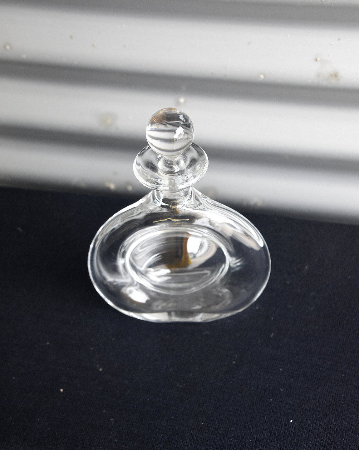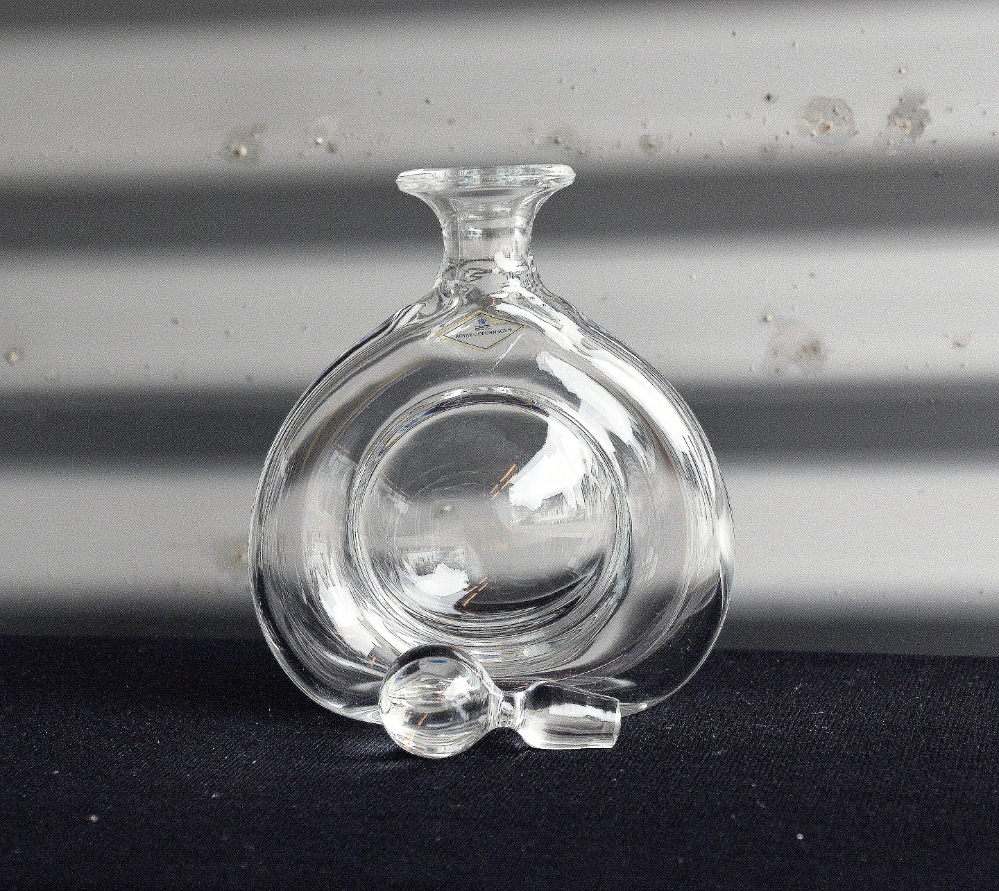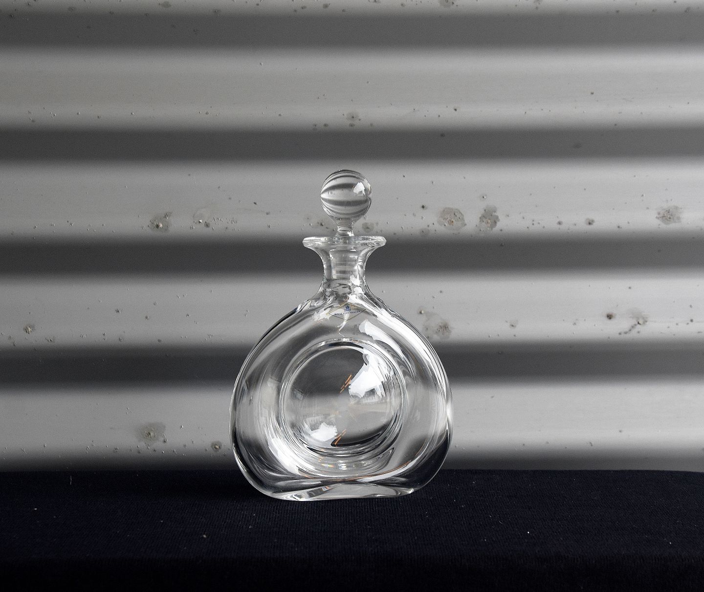 Karaffel fra barserien "Maxim", flad kugleformet korpus med sammenklemt, luftfyldt kugle i midten og hals med udsvejet rand. Massiv kugle prop, kuglet bund