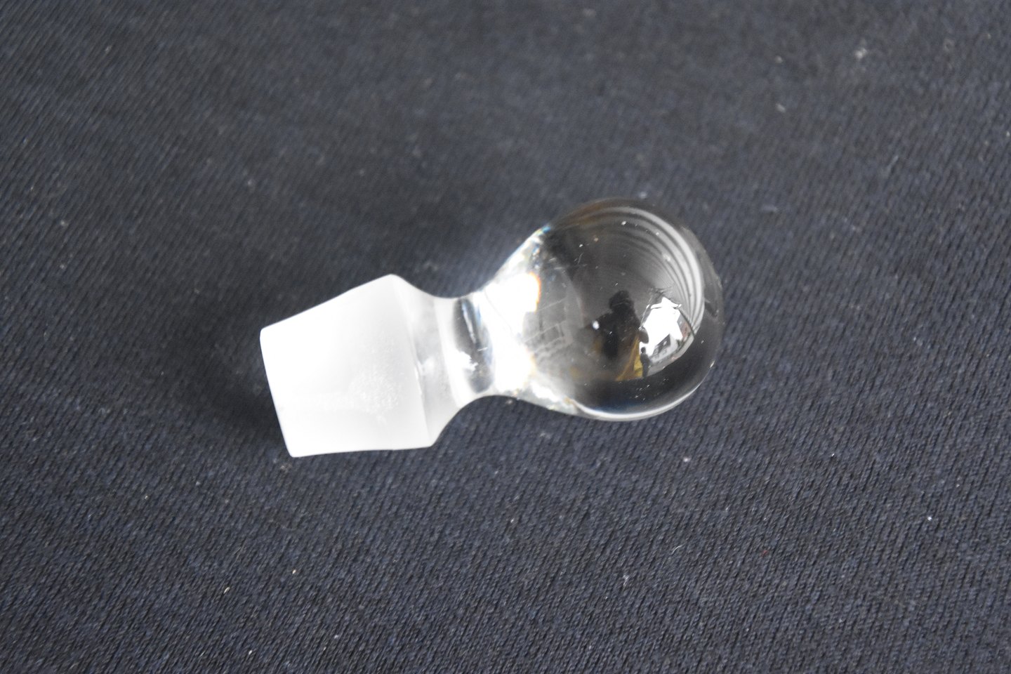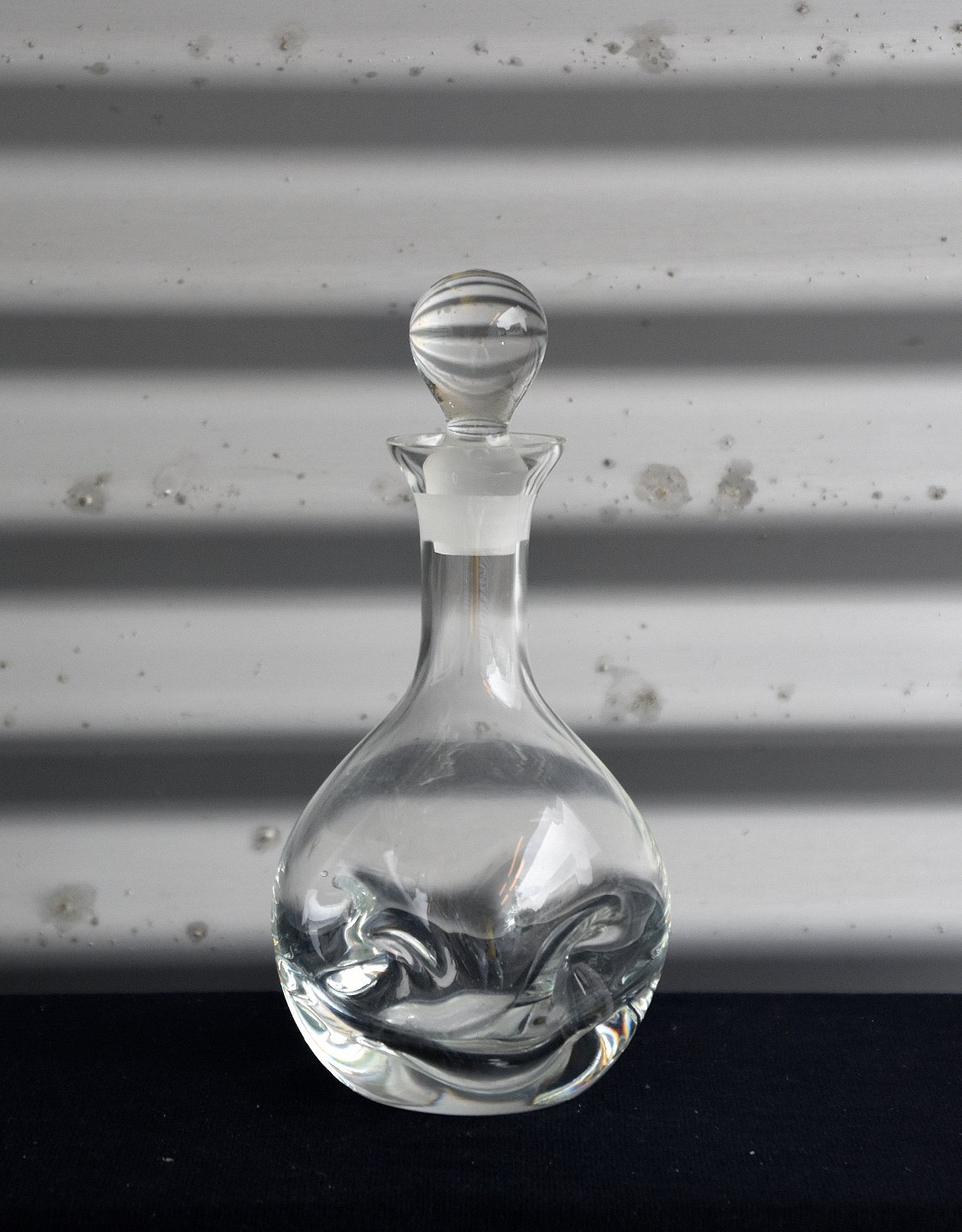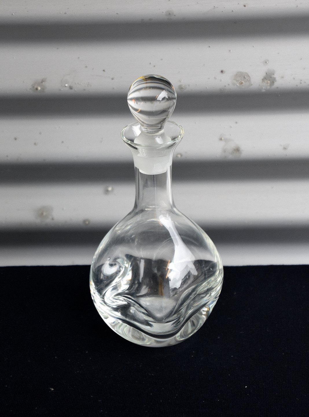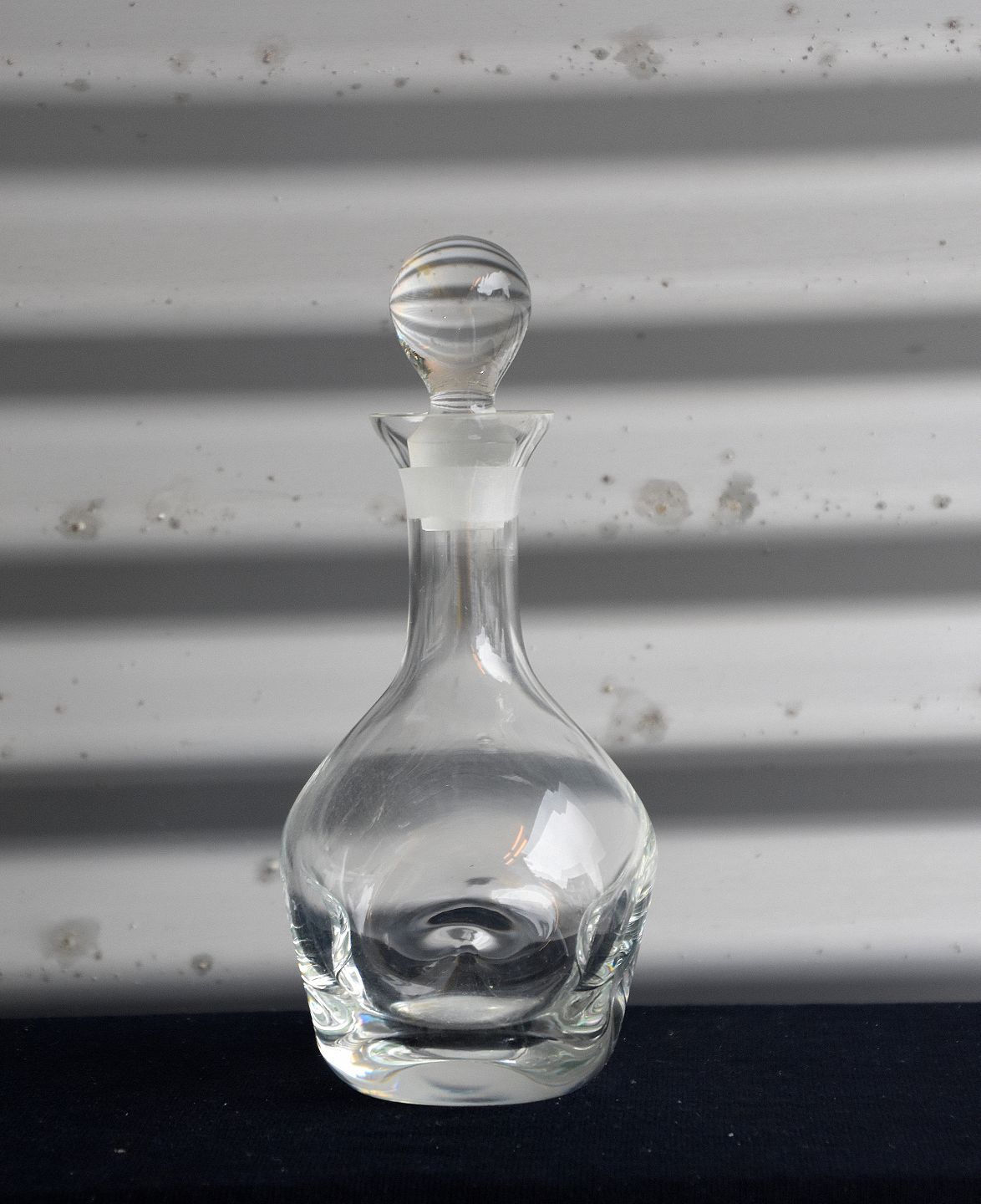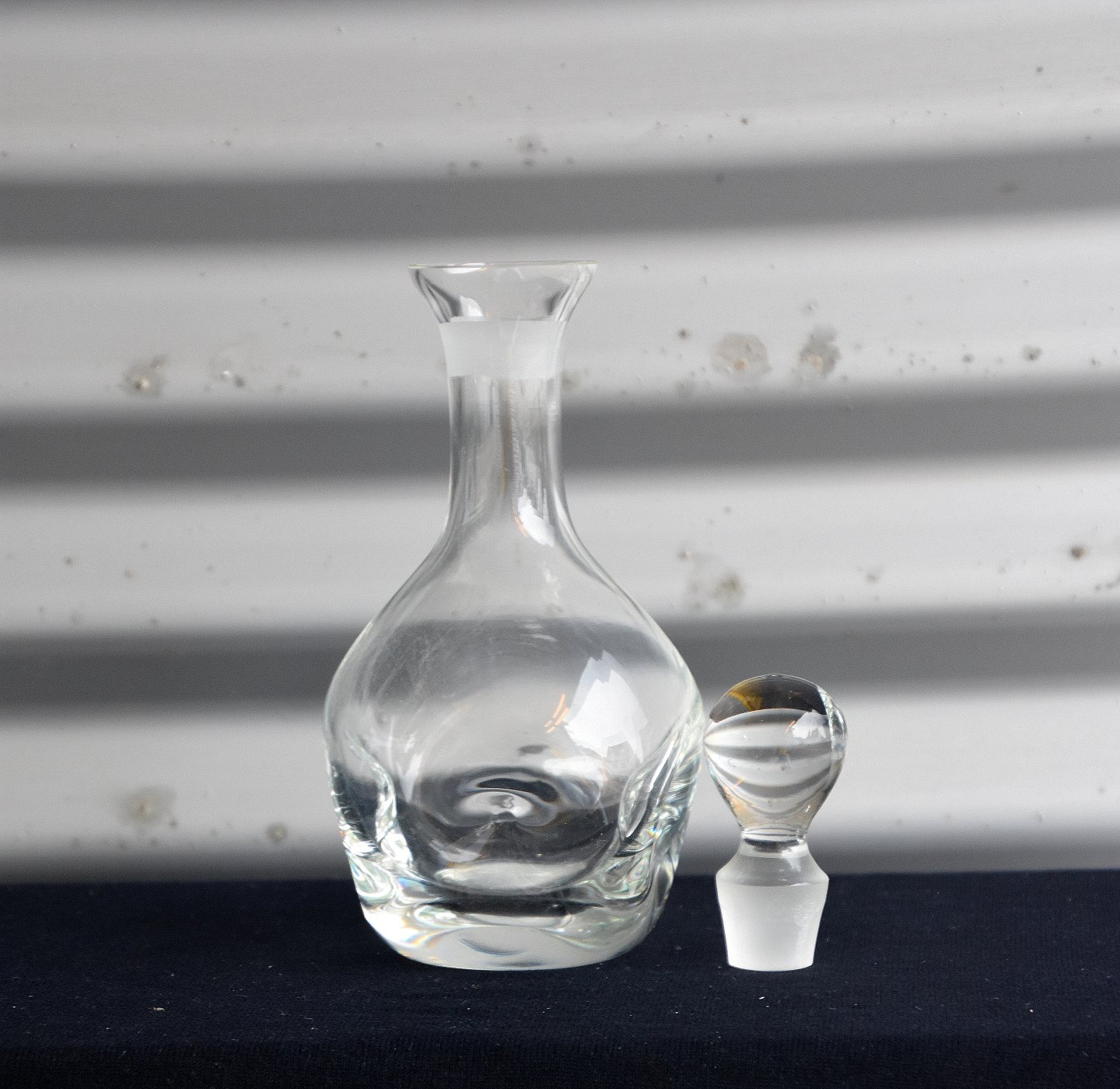 Karaffel, i klart glas, med let trykte sider i bunden. Massiv, klar glasprop.