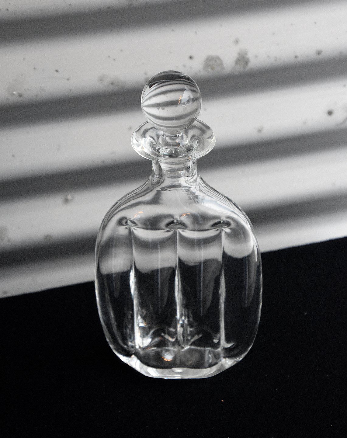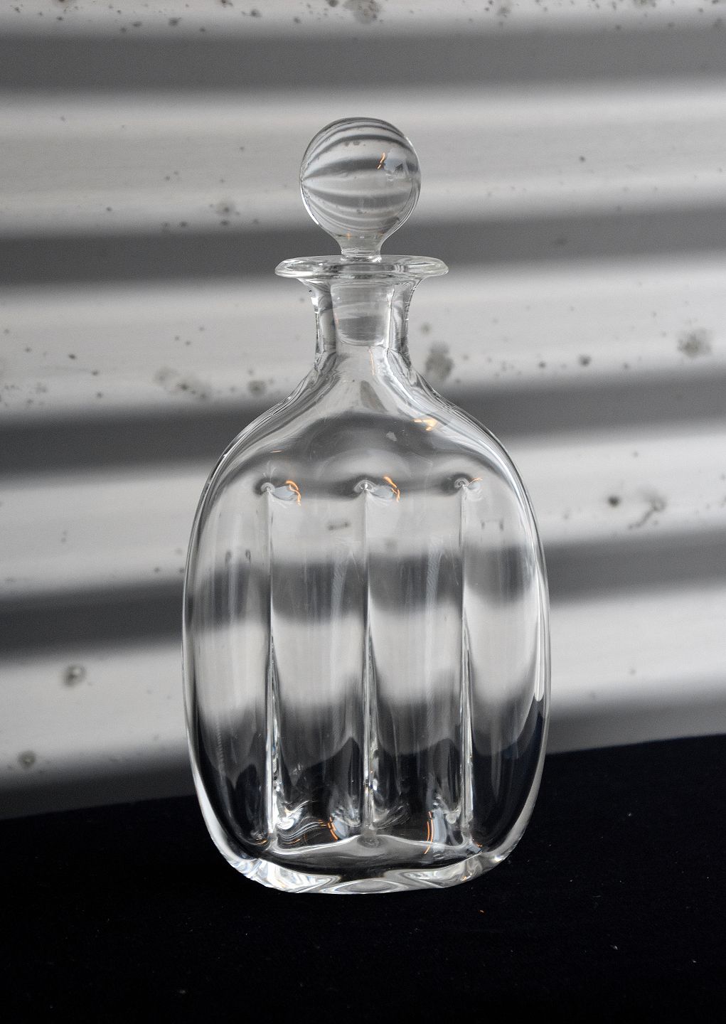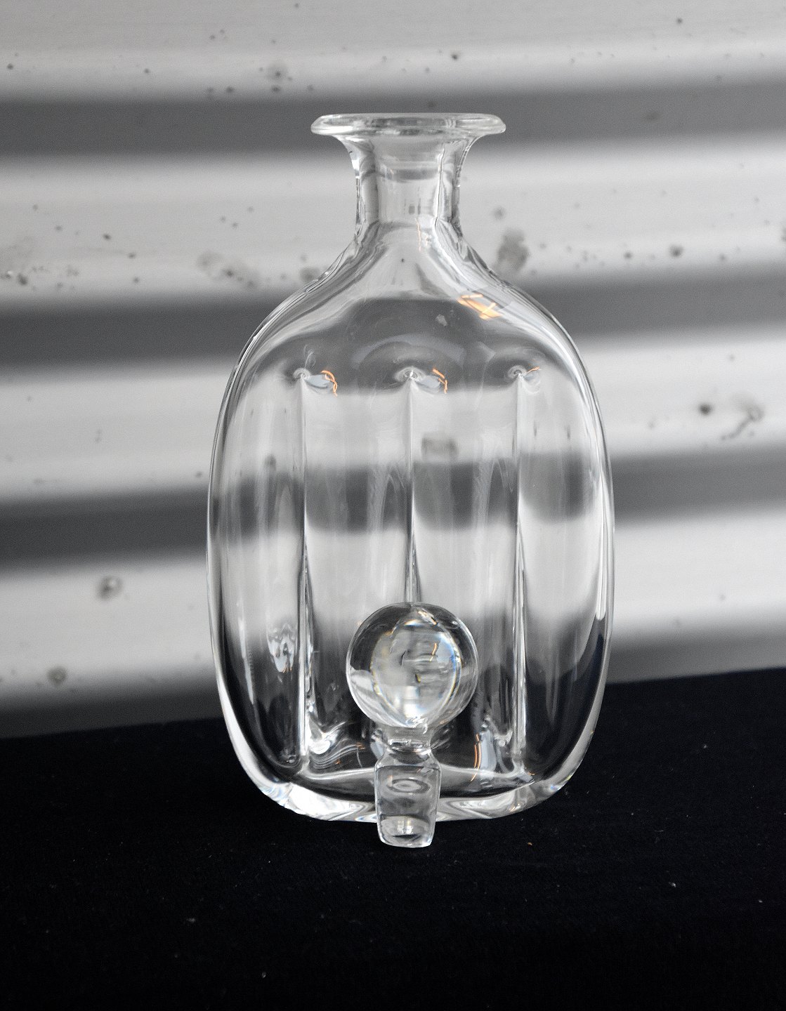 Stor karaffel fra barserien "Maxim". Flad korpus med 3 lodrette sammenklemninger, hals med udsvejet rand. Massiv kugleprop