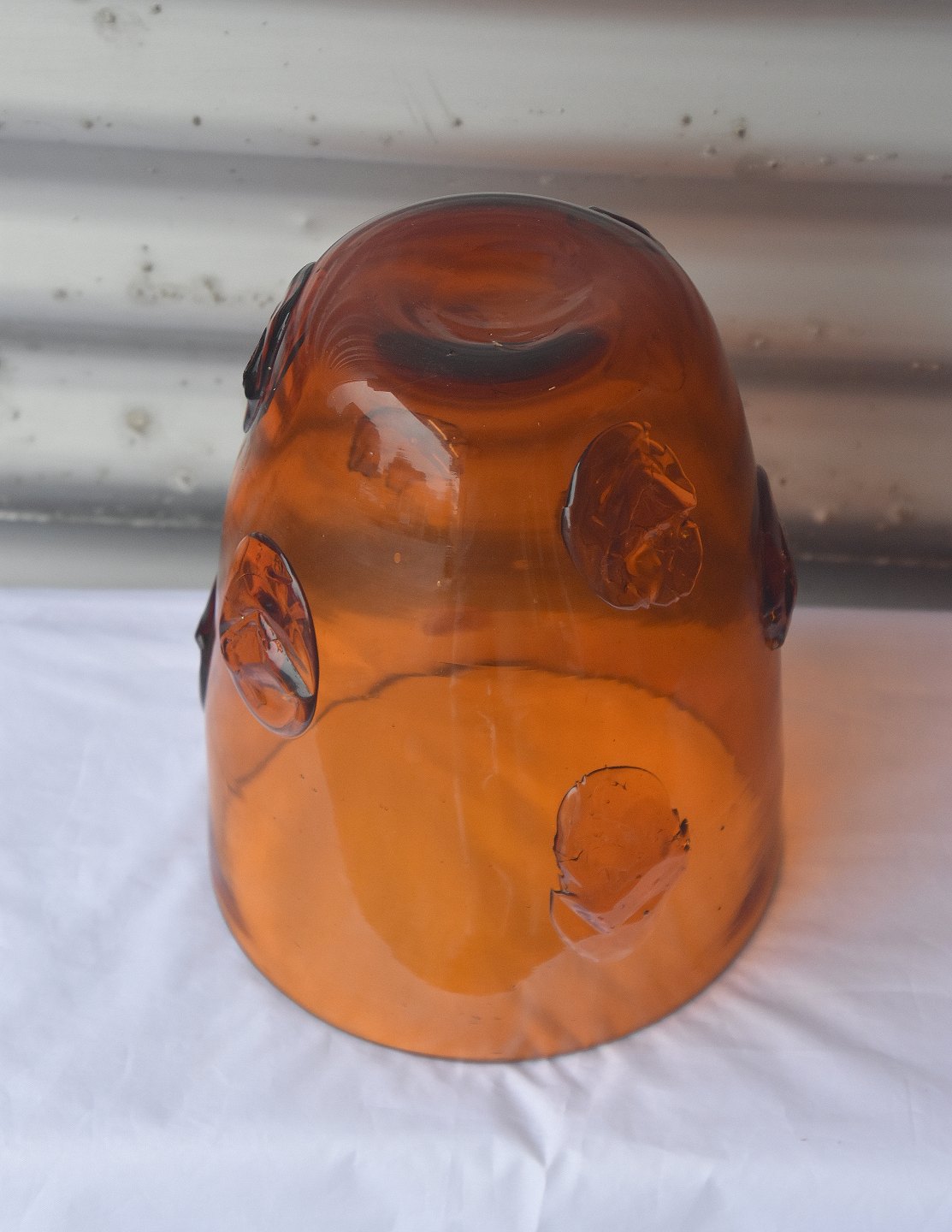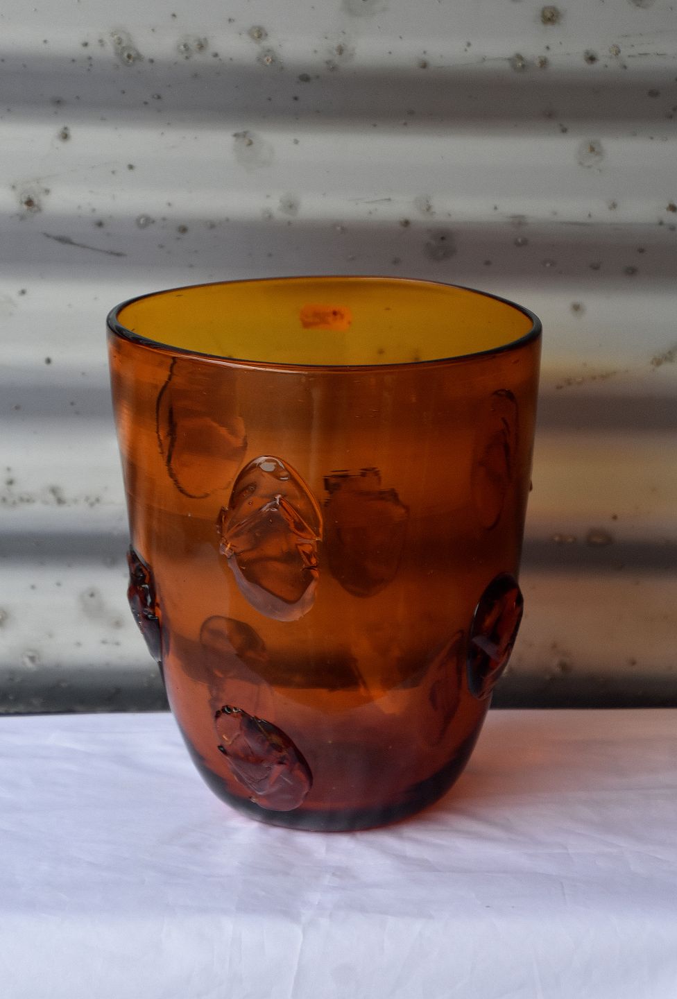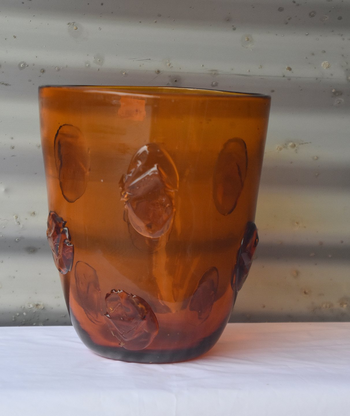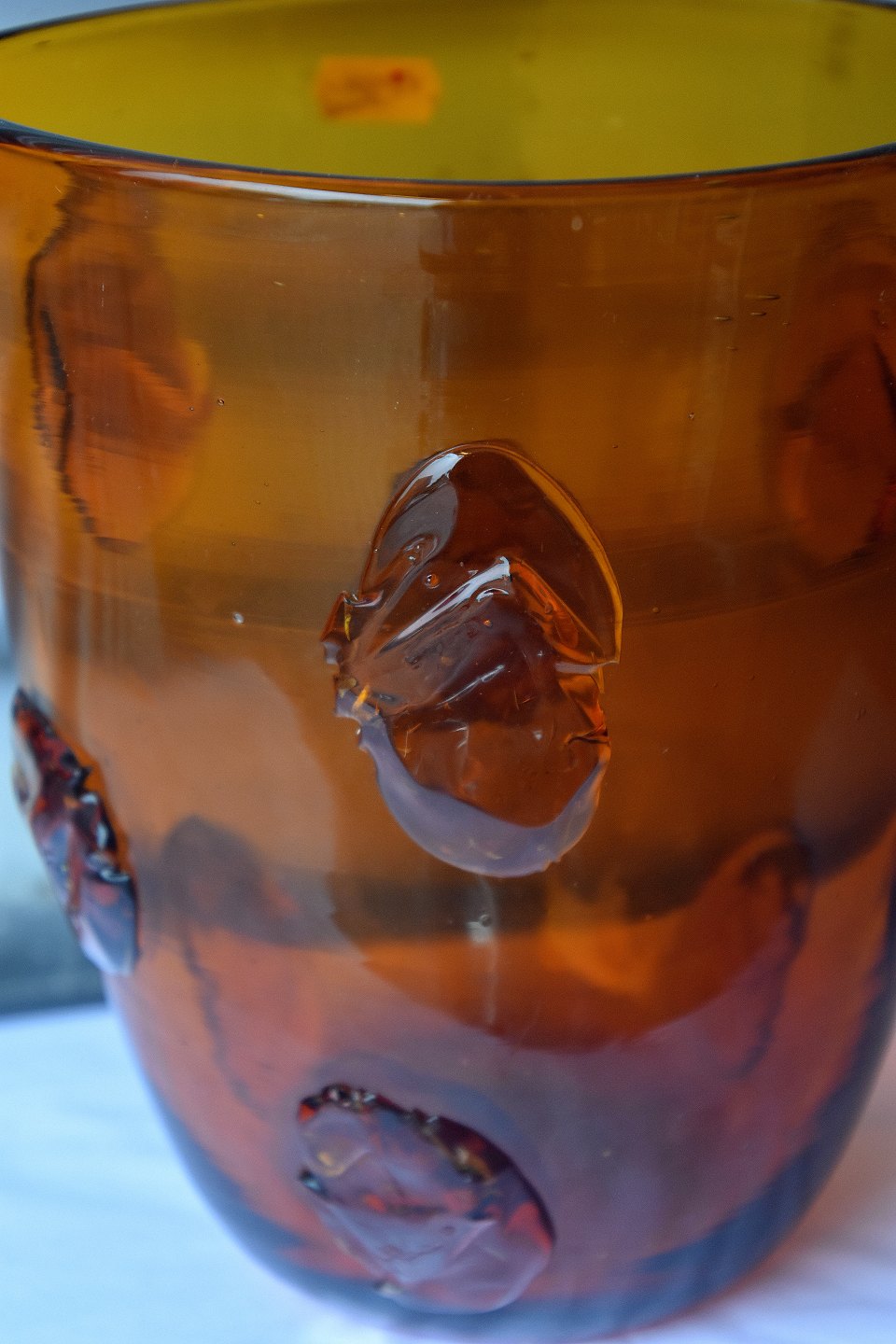 Transparet, brunlig, glasvase med påsatte glassten. Vasen er en gulvvase