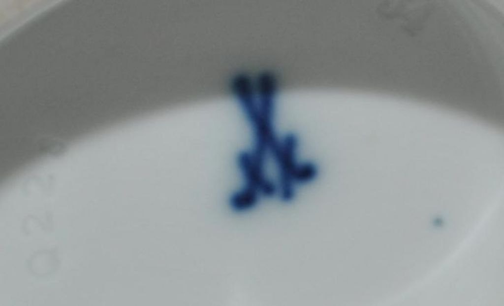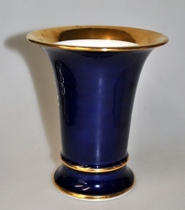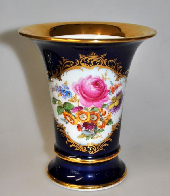 Meissen porcelæns vase, 20. årh. Tyskland. Trompetformet hvidt porcelæn. Dekoreret med coboltblåt og forgyldning. Håndbemalet med blomster i midterfeltet. Stemplet. Med nummer: Q 228. Højde.: 13,5 cm.