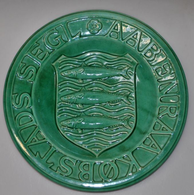 Ruge, Emil (1892 - 1977) Danmark: Fad med Aabenraa Købstads Segl. Grønglaseret lertøj. Signeret.: Emil Ruge, Dybbøl, Danmark. Dia.: 38 cm.