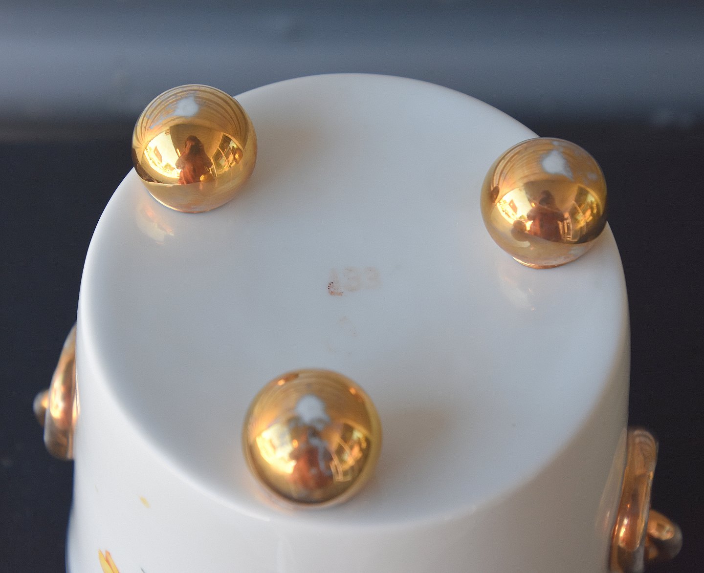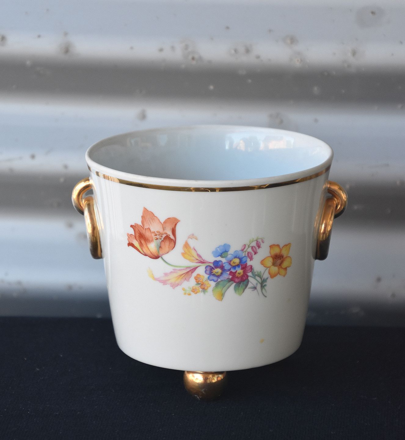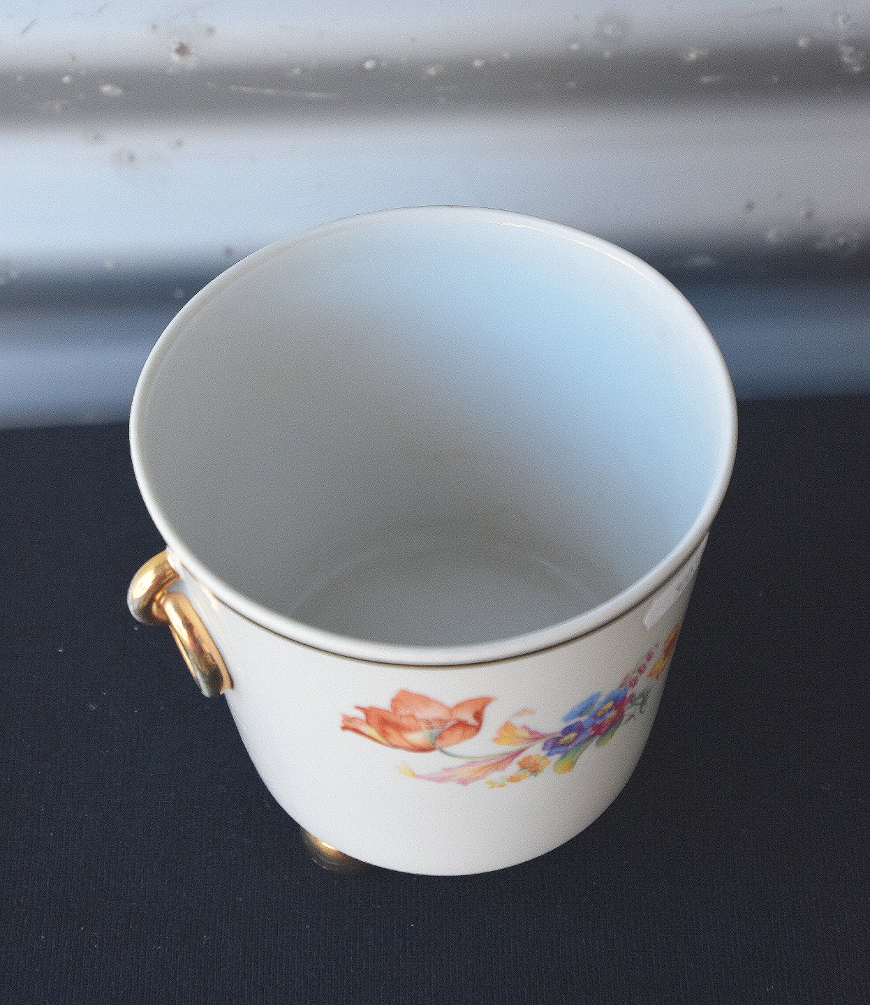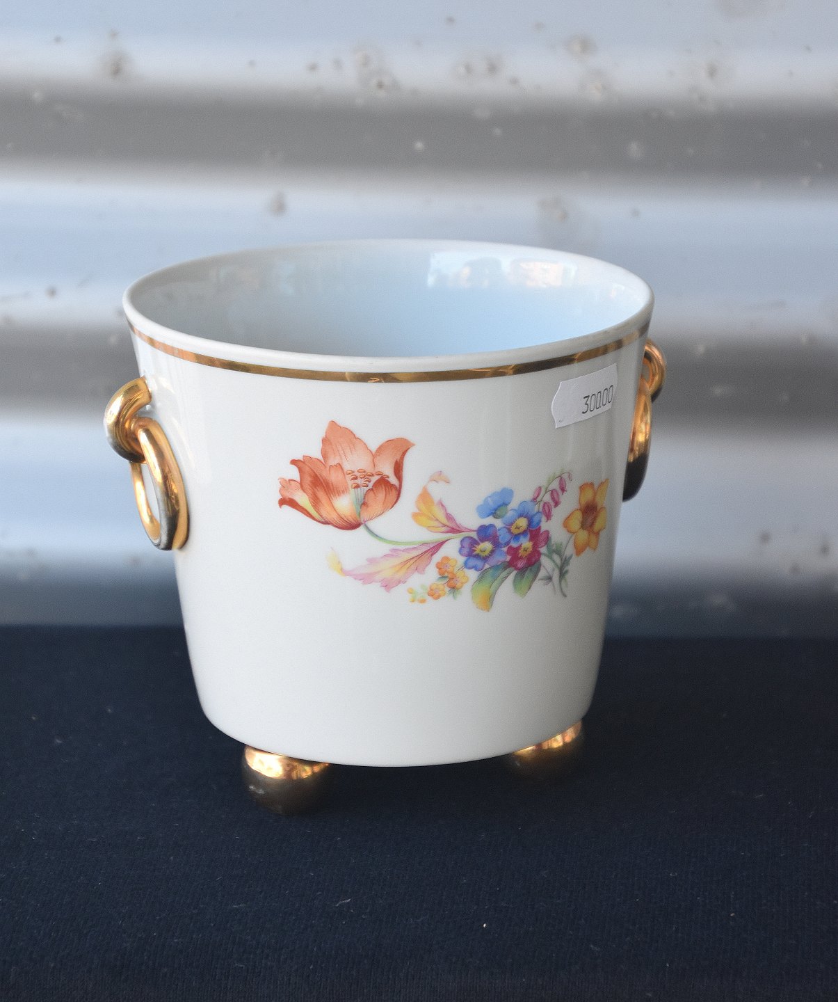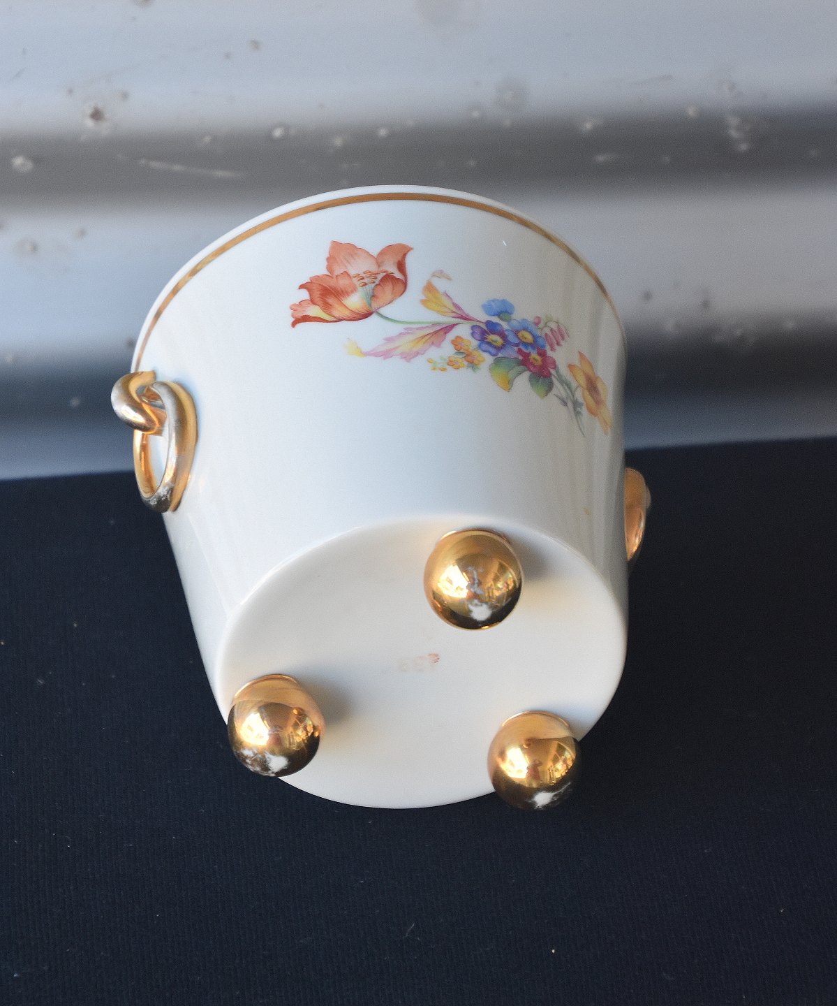 Tysk urtepotteskjuler på guldbelagt kuglefødder. Urtepotteskjuleren er dekoreret med blomstermotiv i overførselsteknik, samt delvis forgyldning