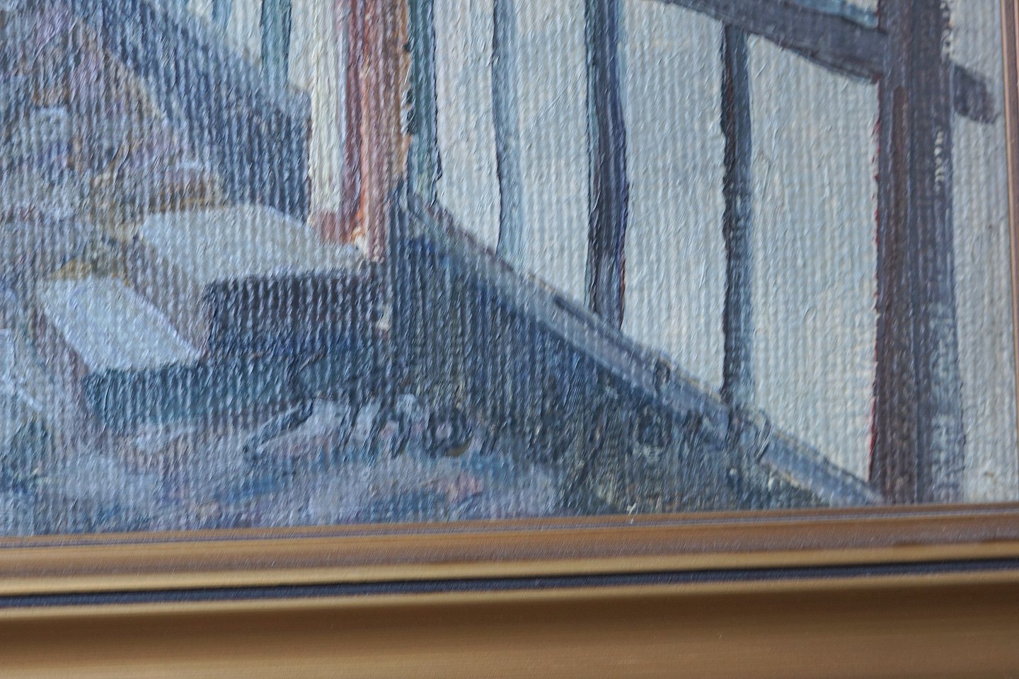 Hus for enden af en brostensbelagt vej. Maleri, olie på lærred