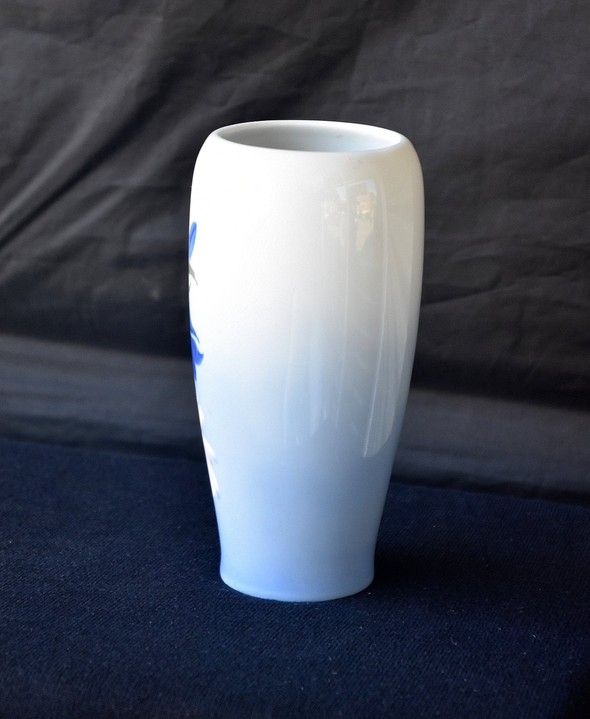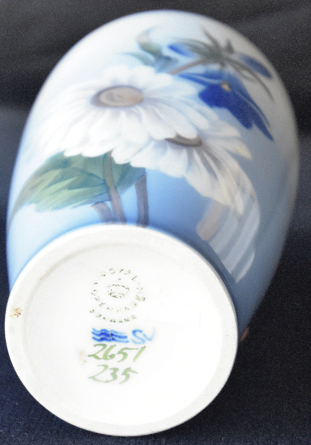 Royal Copenhagen vase, 2651/235, dekoreret med hvide margueritter og blå klokkeblomster.