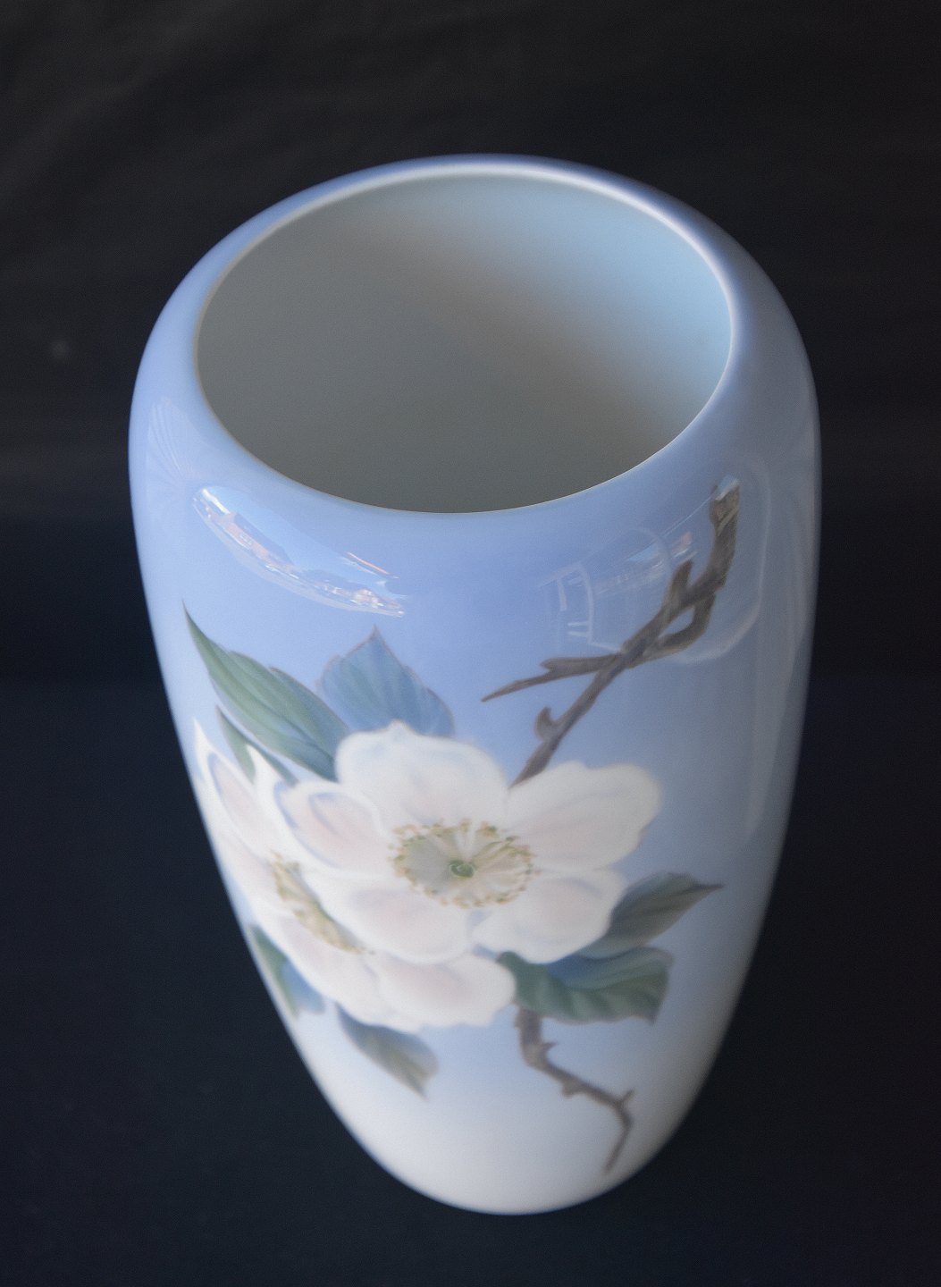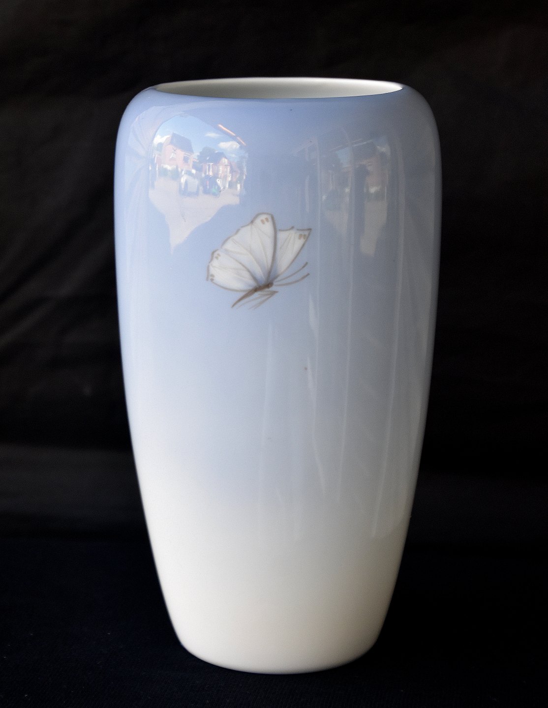 Royal Copenhagen vase, 2630/1049, dekoreret med motiv af vildrose i sart rosa, og bagpå en sommerfugl