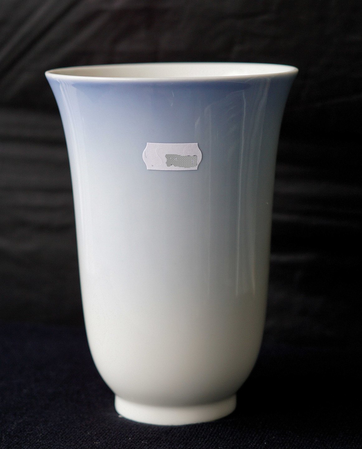 Lyngby Porcelæn, vase 71-2/76, 1. sortering. Dekoration landskab med stråtækt hus, vasen er håndmalet