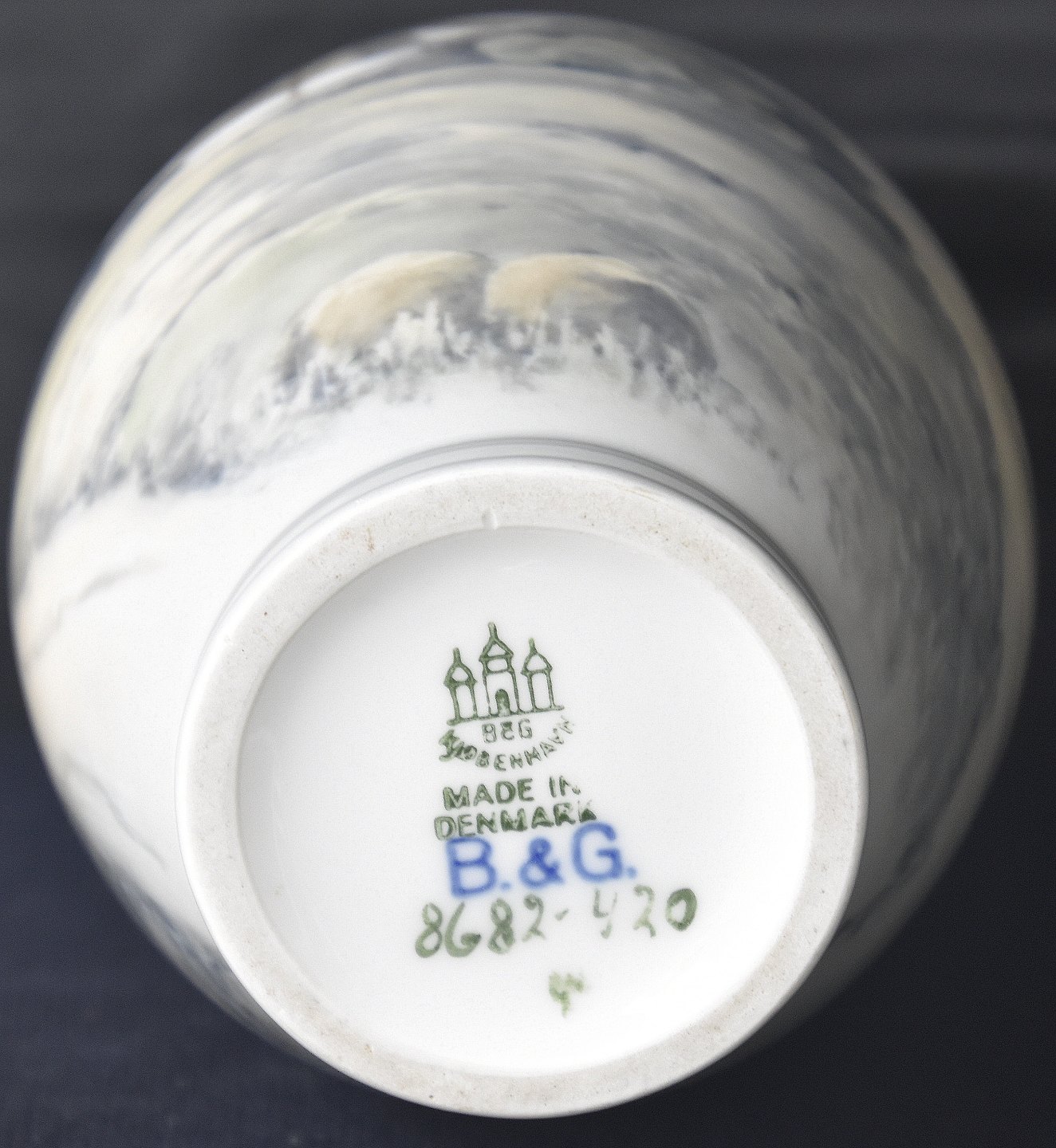 Bing & Grøndahl, vase 8682-420, 1. sortering. Vasen er dekoreret med landskab og motiv af vindmølle