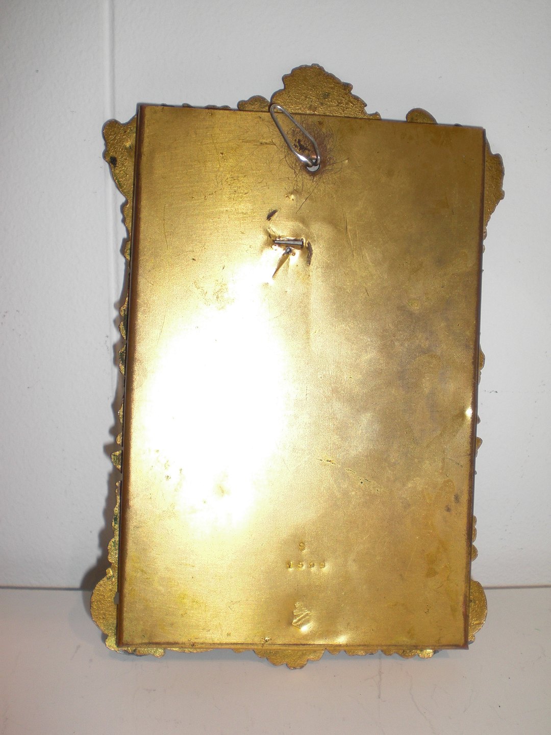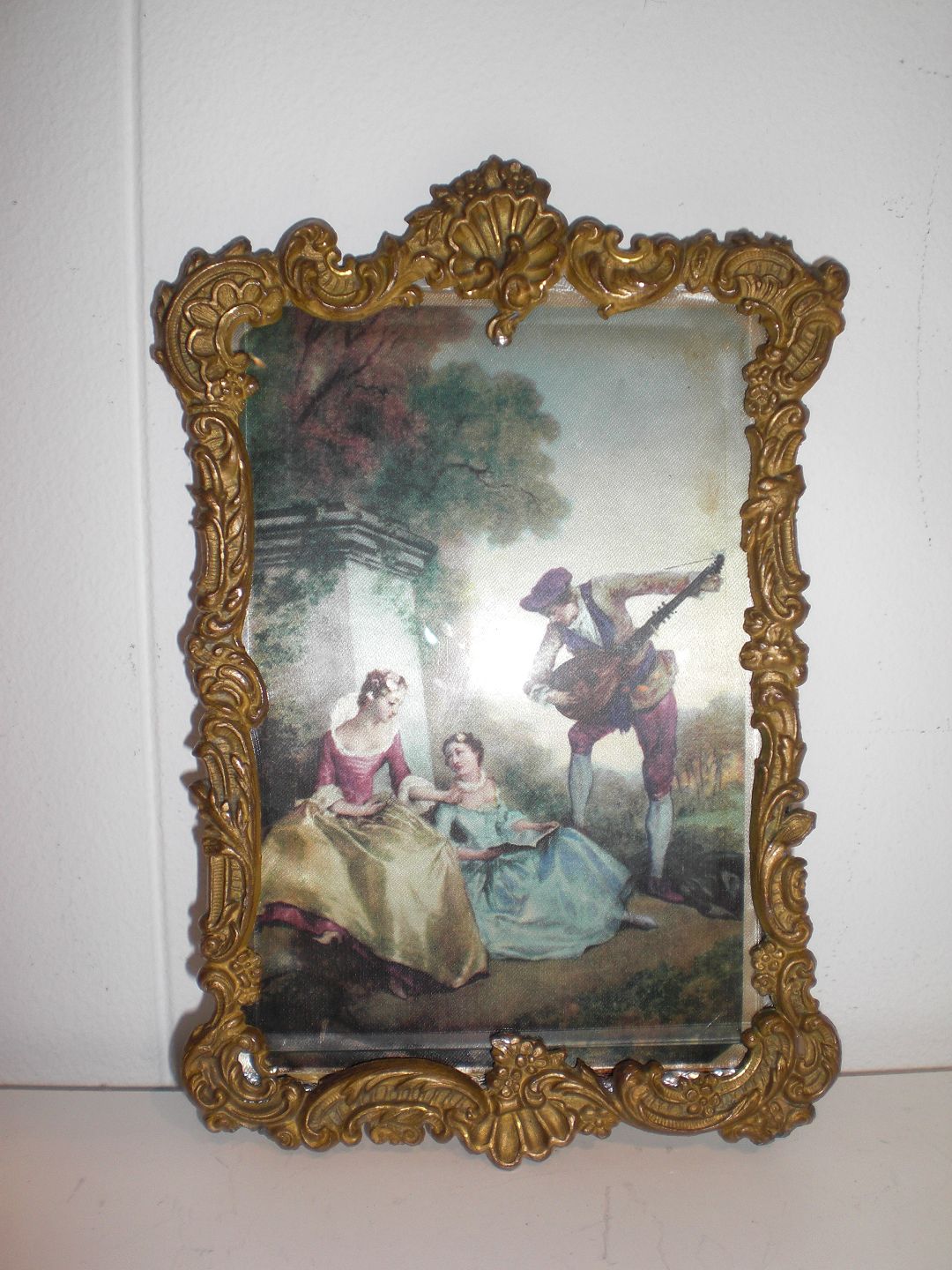 Ramme i bronze i rokokostil med kantslebet glas med nyere ophængklips, stander væk. Isat silketryk i rokokostil. Ydre mål: 19,3 x 11,7 cm.