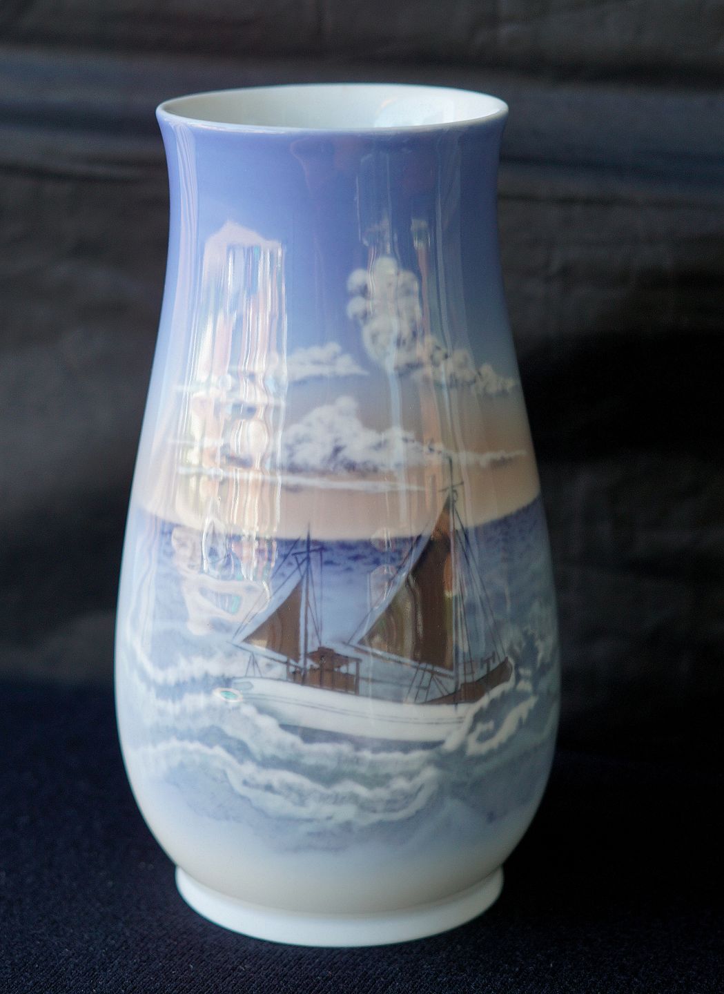 Bing & Grøndahl, B&G, vase, porcelæn, fiskekutter, fisk, kutter, åbent hav, hav, bølgeskvulp, bølge, fiskebåde