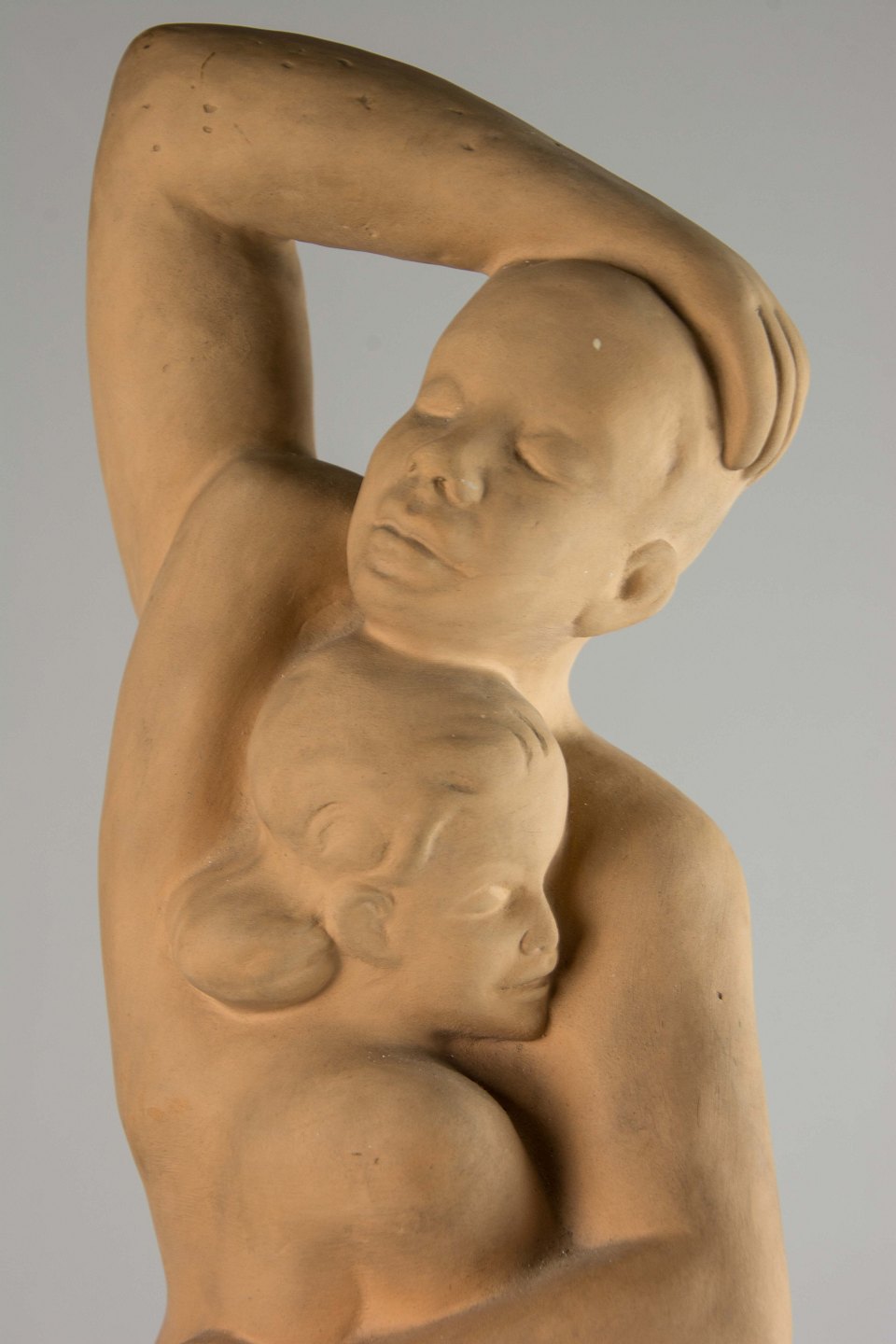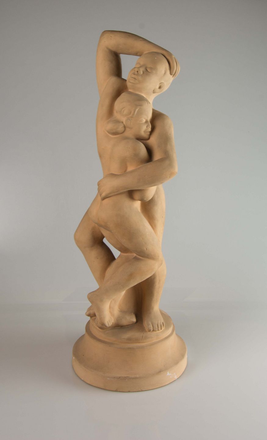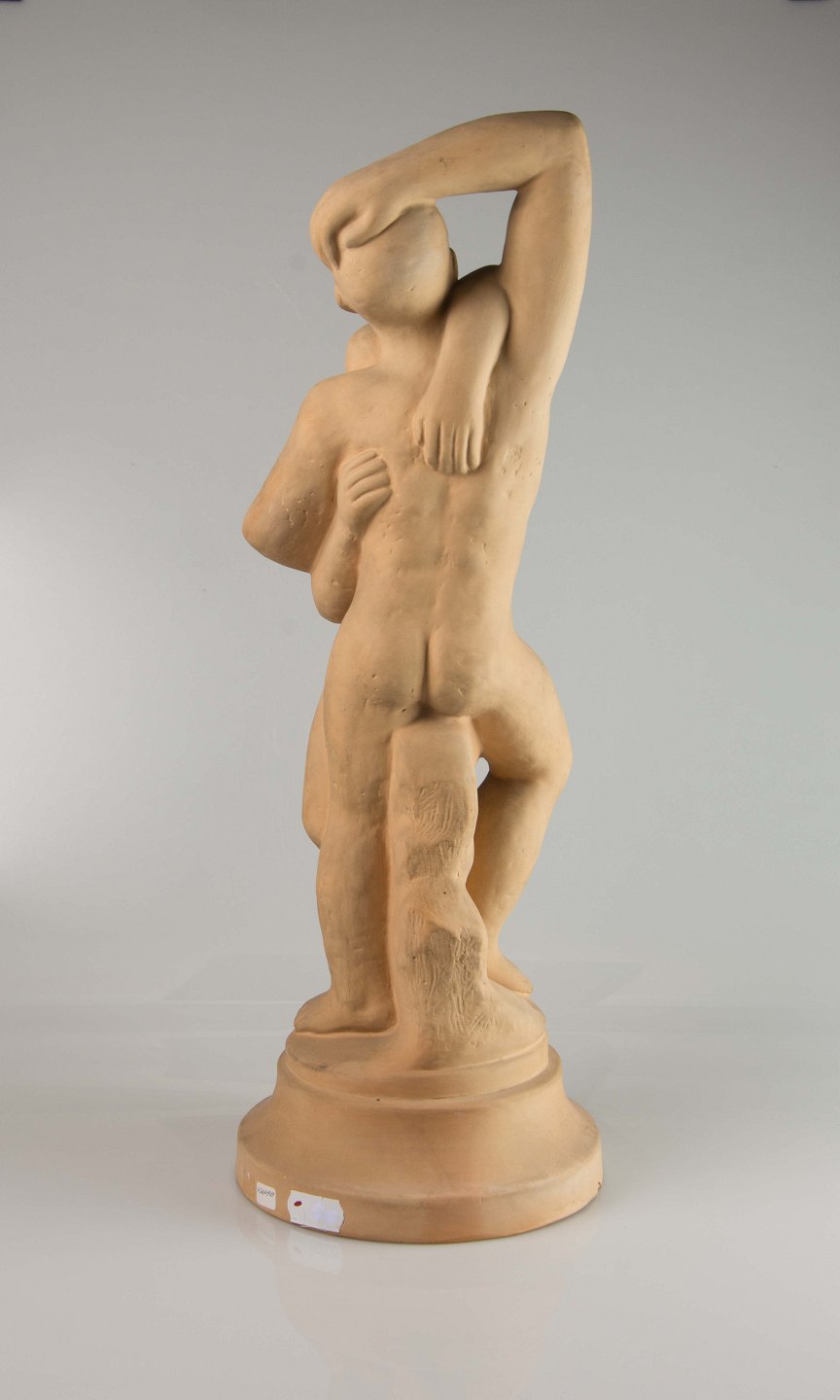 Figur i keramik med motiv af mand og kvinde i åben omfavnelse.