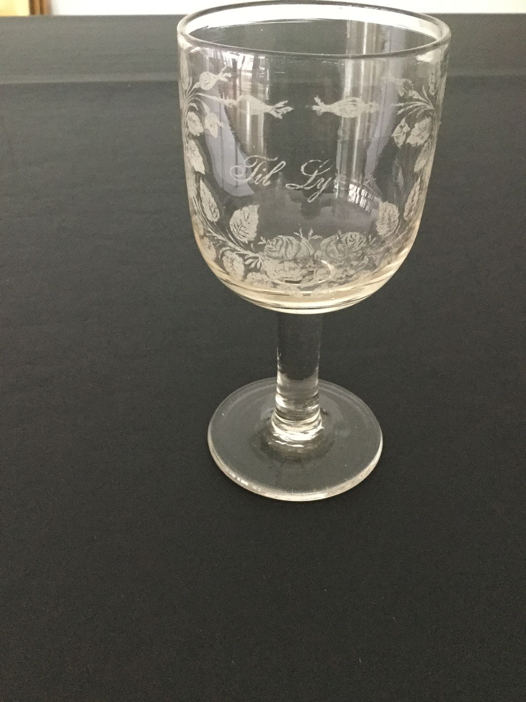 Erindringsglas dekoreret med ætset motiv.