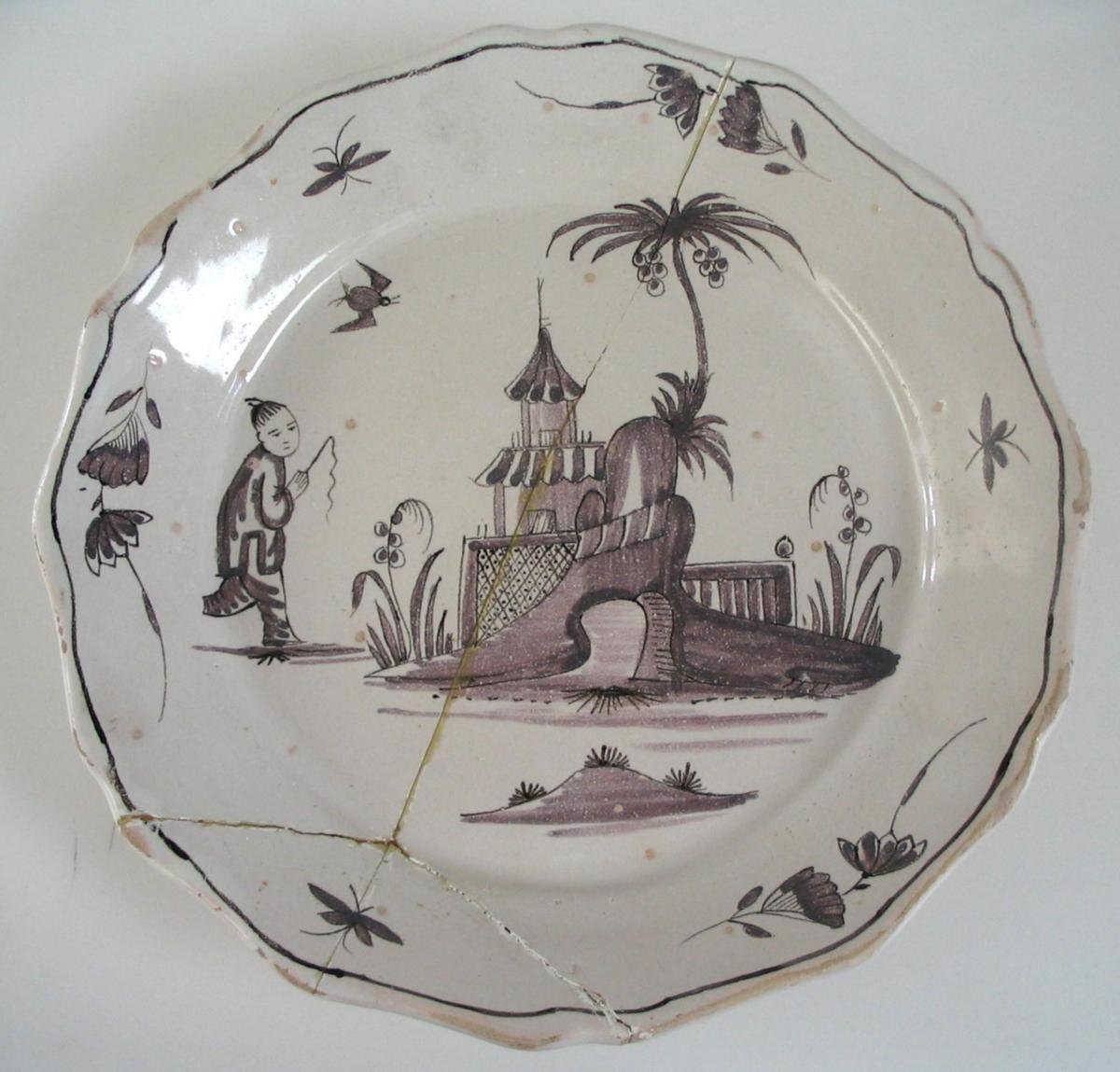Fajancetallerken, 18. årh. Europa. Manganviolet, fliget fane med strøblomster og insekter. På spejl kinesisk landskab med kineser, pagode, palmer med kokosnødder, buske og flyvende fugl. Dia.: 22,5 cm. Limet. Usigneret.