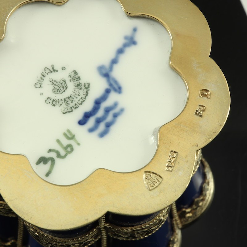Royal Copenhagen / A. Michelsen. Margrethebæger i porcelæn med forgyldt sølvmontering. 1956.