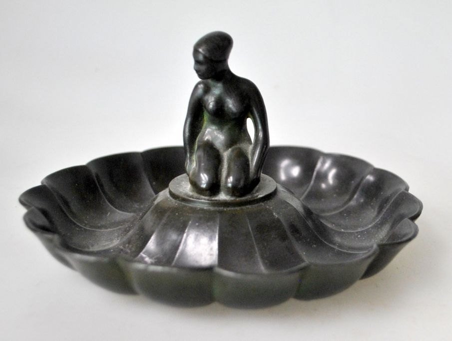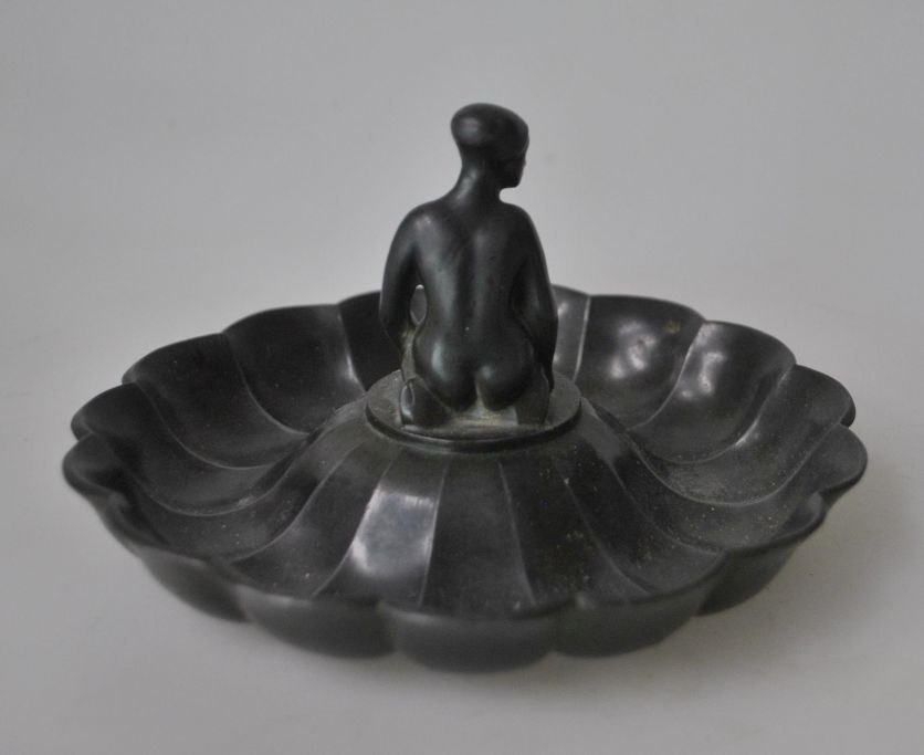 Just Andersen askebæger med kvindefigur, 20. årh. Danmark. Diskometal.