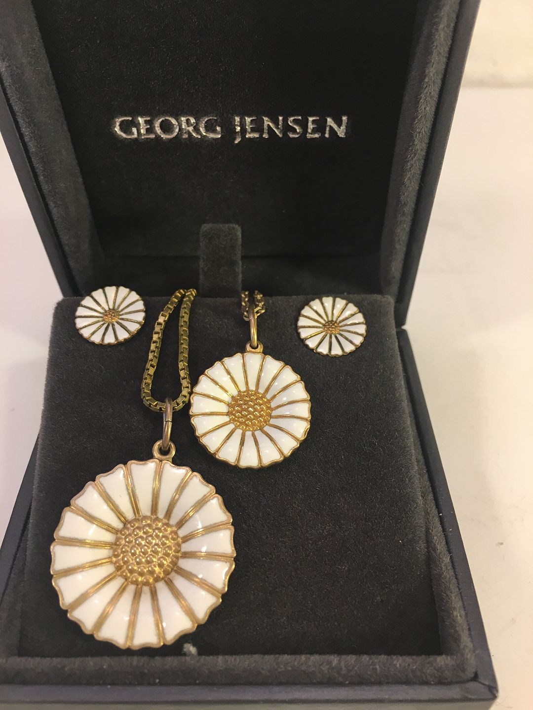 Daisy Forgyldt. Sølv Margurite fra Georg Jensen med Hvid Emalje.