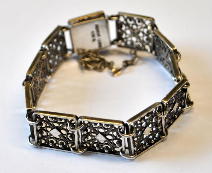 Norsk armbånd i sølv, filigran, 20. årh. Stemplet: Henrik Lund. Indvendig: 5,5, cm. Vægt.: 24,6 gram.