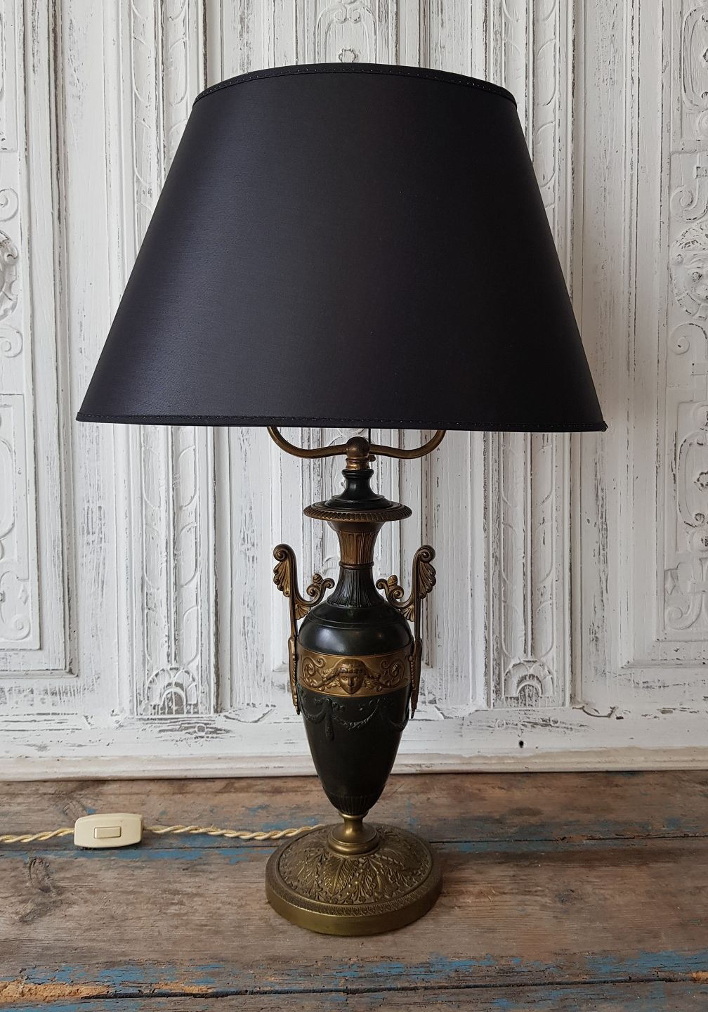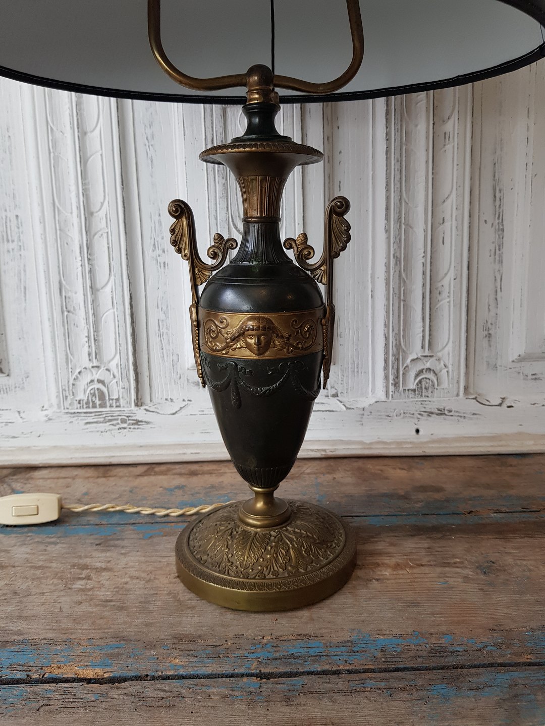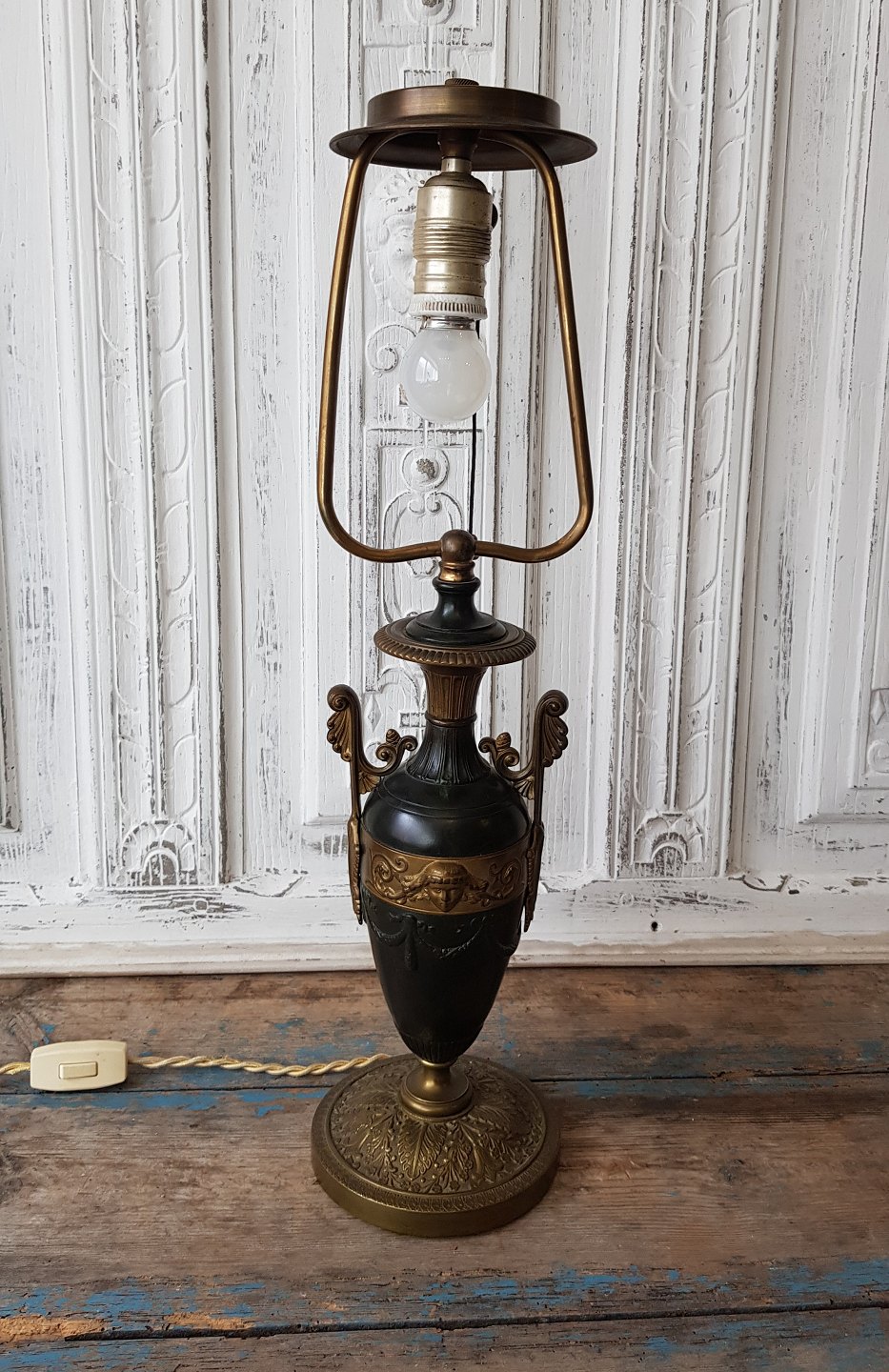 Fransk vaseformet bordlampe i forgyldt og patineret bronze