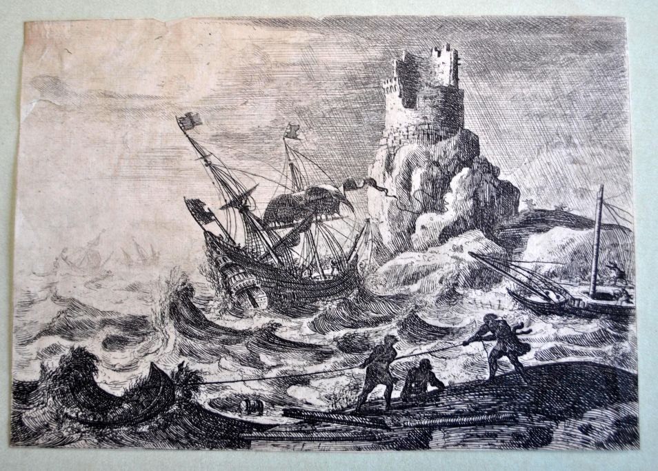Hollandsk kunstner (18. årh.): Skibsforlis ved kysten. Kobberstik. Usigneret. 12,5 x 18 cm.
