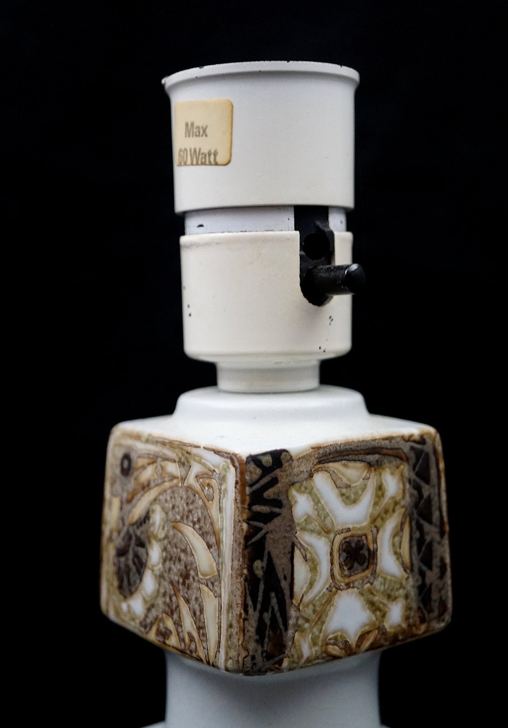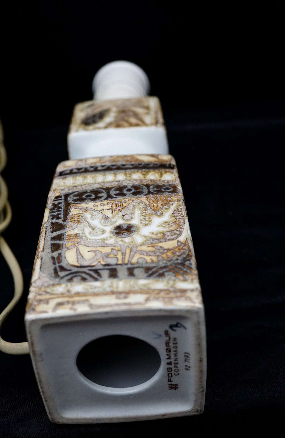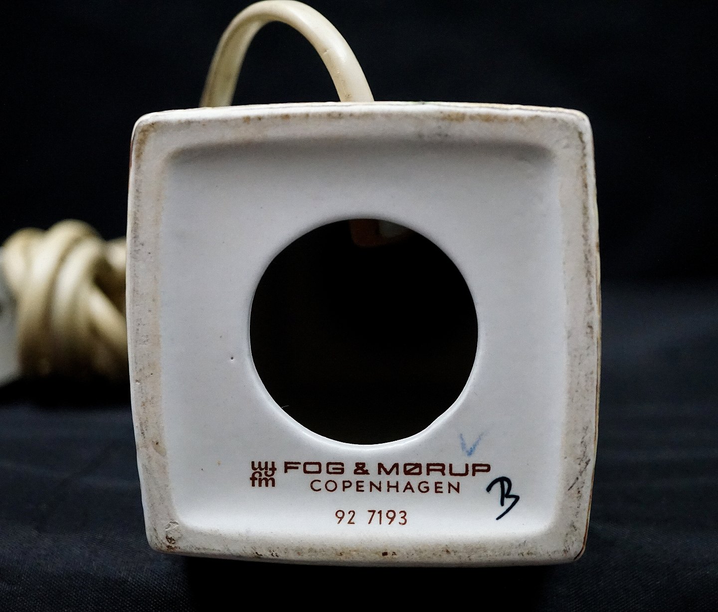 Text available in Danish: Royal Copenhagen Baca, produceret for Fogh & Mørup lampefod nr. 92/7193. Lampefoden er i fajance, lille model