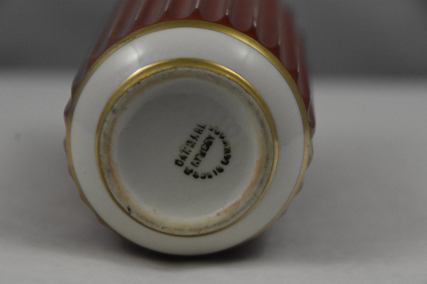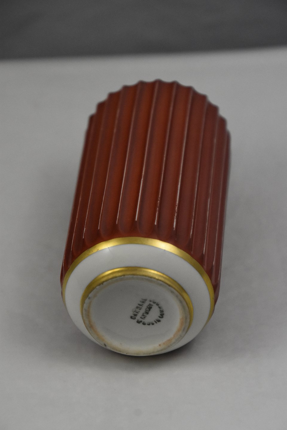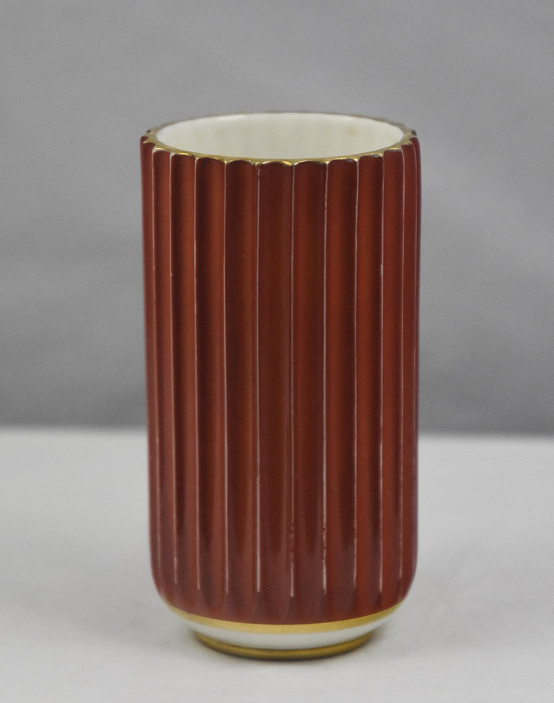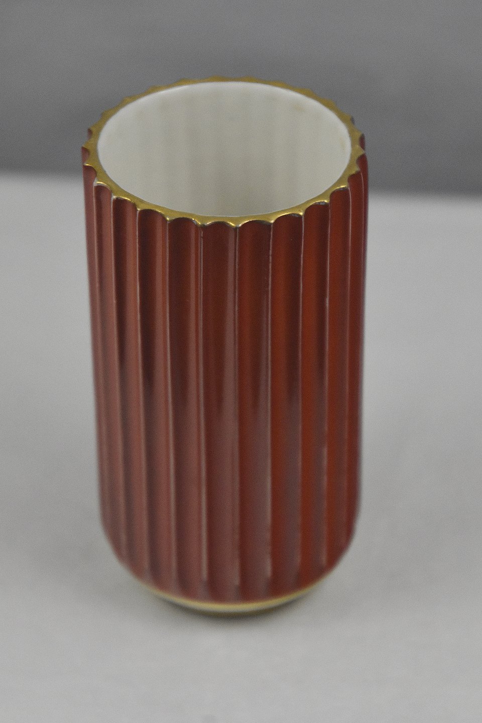 Rød Lyngby vase i porcelæn med riflet korpus og guldkant