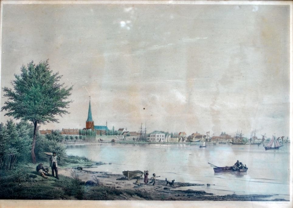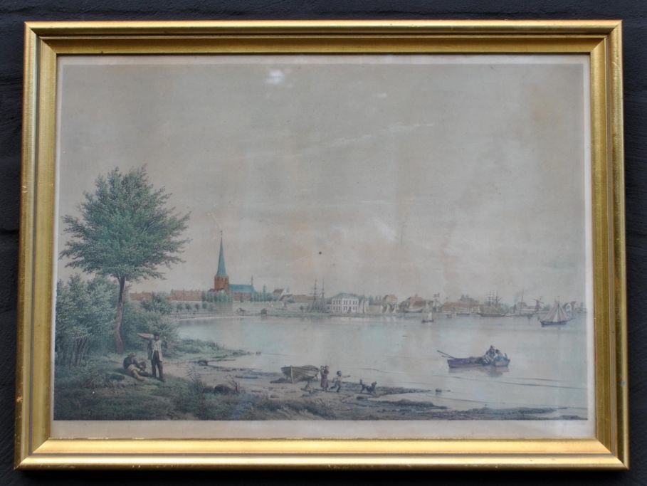 Prospekt over Nyborg, 19. årh. Danmark. Håndkoloreret litografi. 32 x 46. Udgivet af I. W. Tegner & Kittendorff. København.