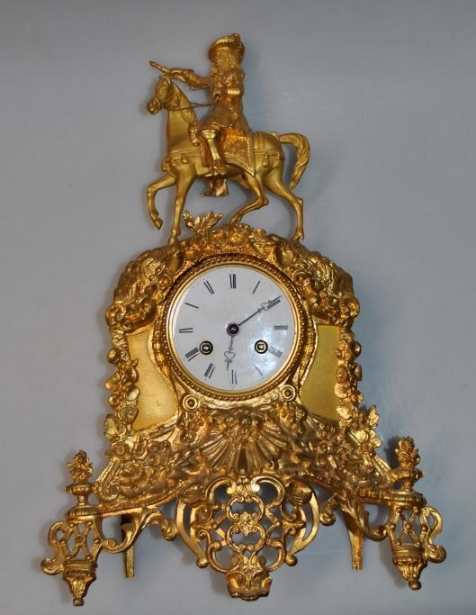 Fransk lueforgyldt kaminur, ca. 1830. Topfigur i form af konge. Kasse dekoreret med rocailler og bladvæk. Med emalje skive med romertal. Urværk stemplet L. Japy Fils. H.: 37 cm. Med snor ophæng.