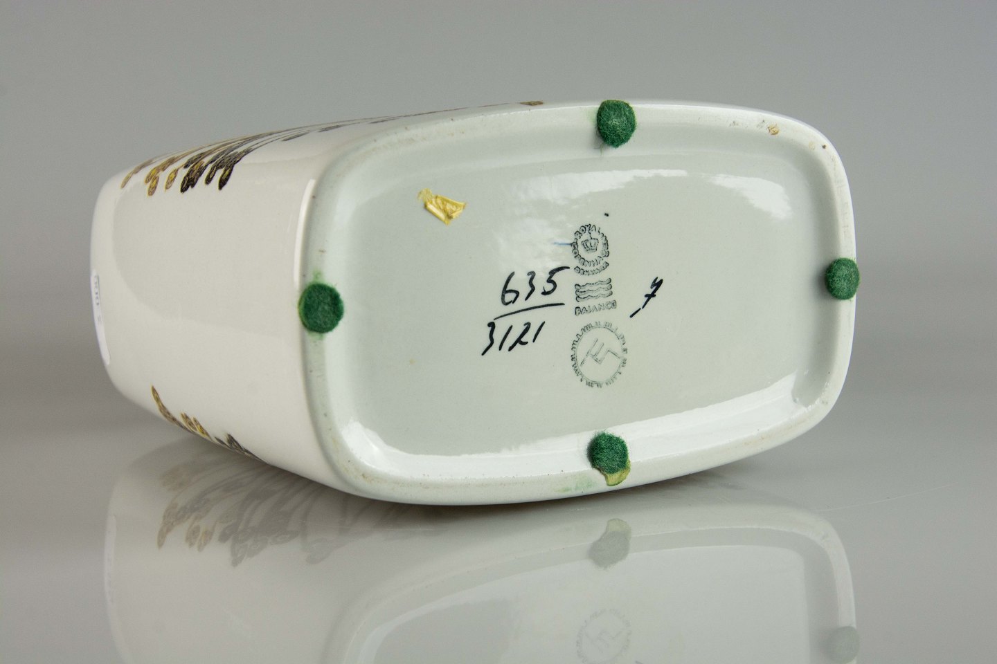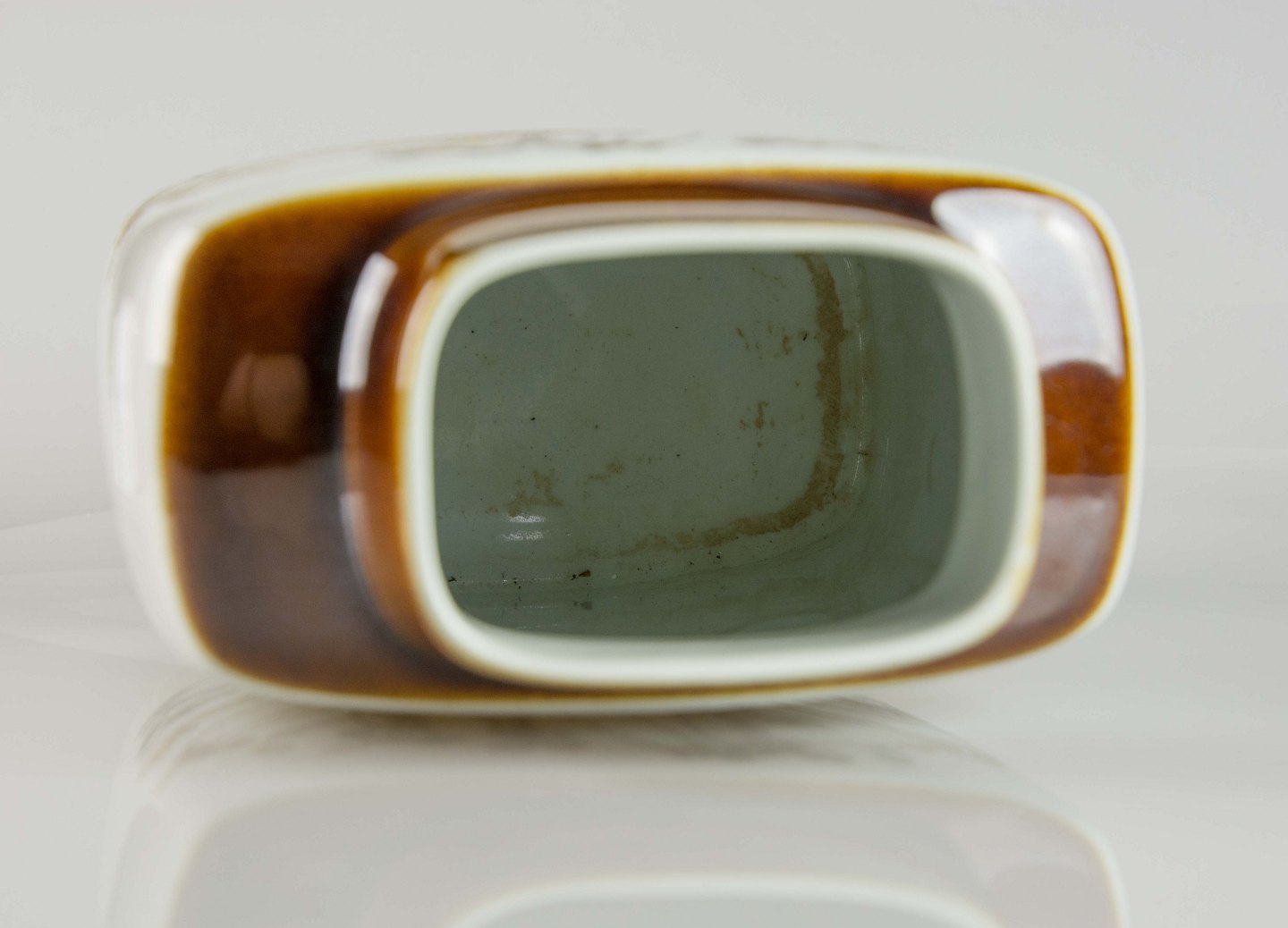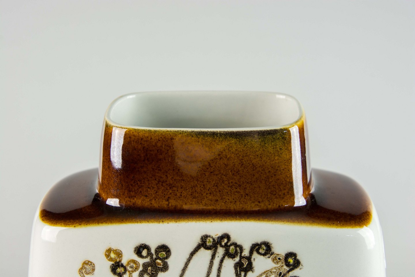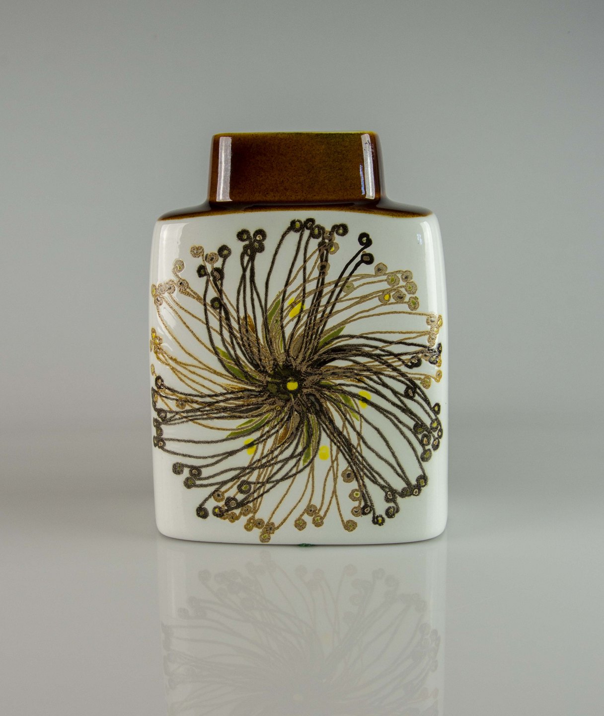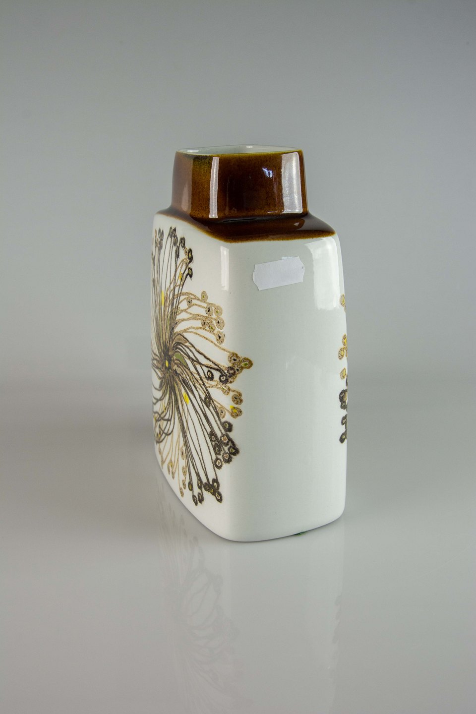 Vasen er i lys fajance med brun topkant og mønster i brungyldne nuancer.