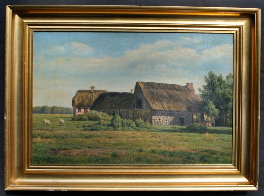 Birkhammer, Axel Johannes Emil (1874 - 1936) Denmark: Sheep at a farm. Oil on canvas. Signed. 50 x 80 cm.