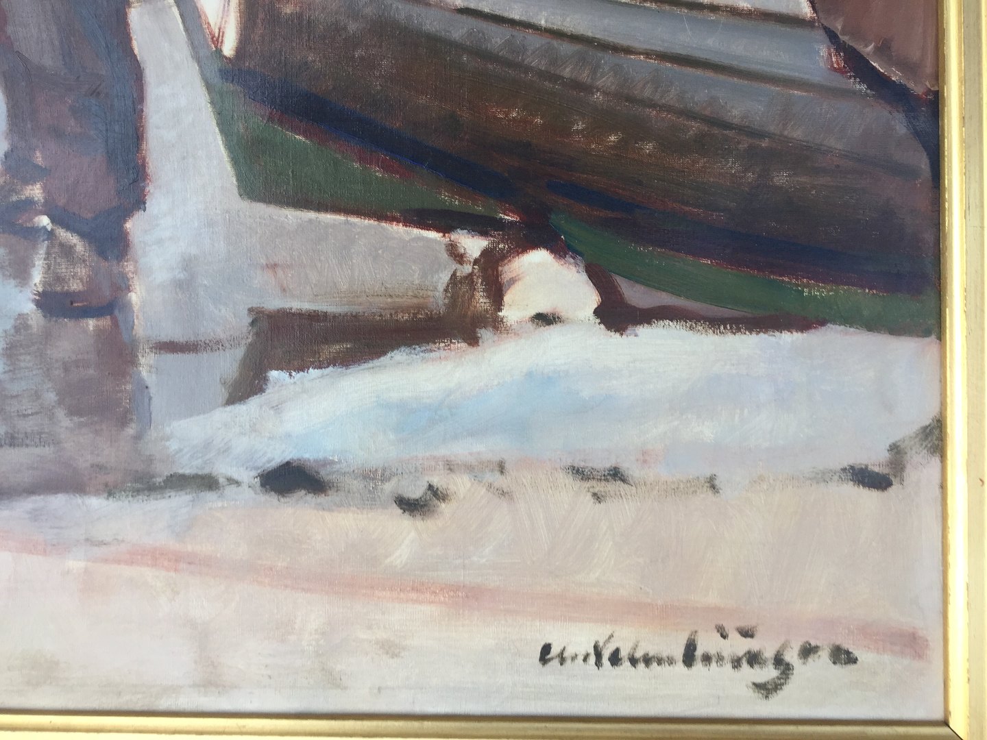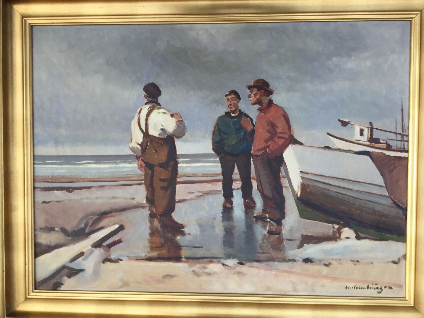 Text available in Danish: Maleri af Christian Valentinussen - 3 fiskere på stranden ved Vestkysten.